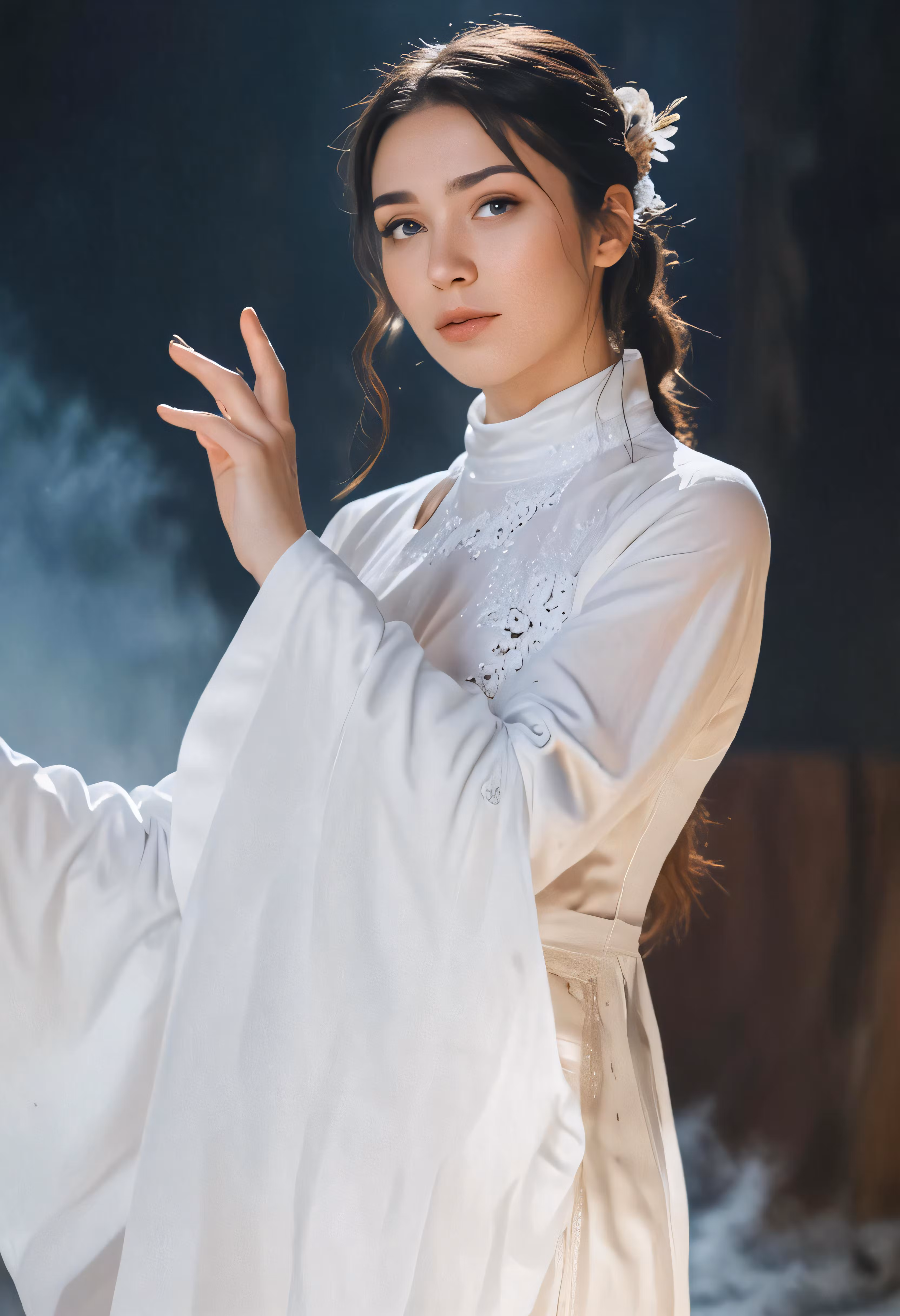 High resolution picture, free to use, a woman standing on the snow wearing a white outfit