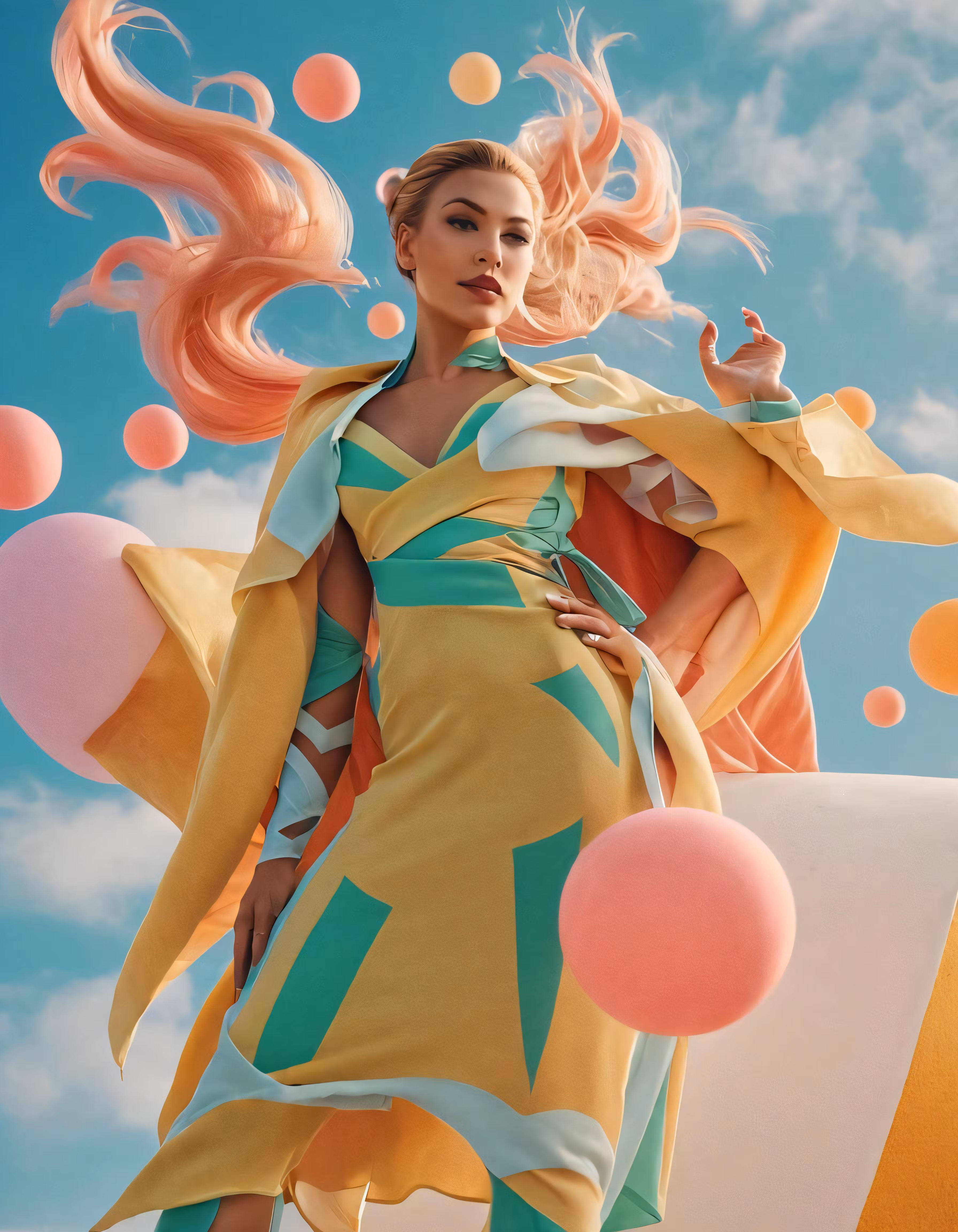 High resolution picture, free to use, a woman standing on top of a cement structure wearing a brightly colored dress