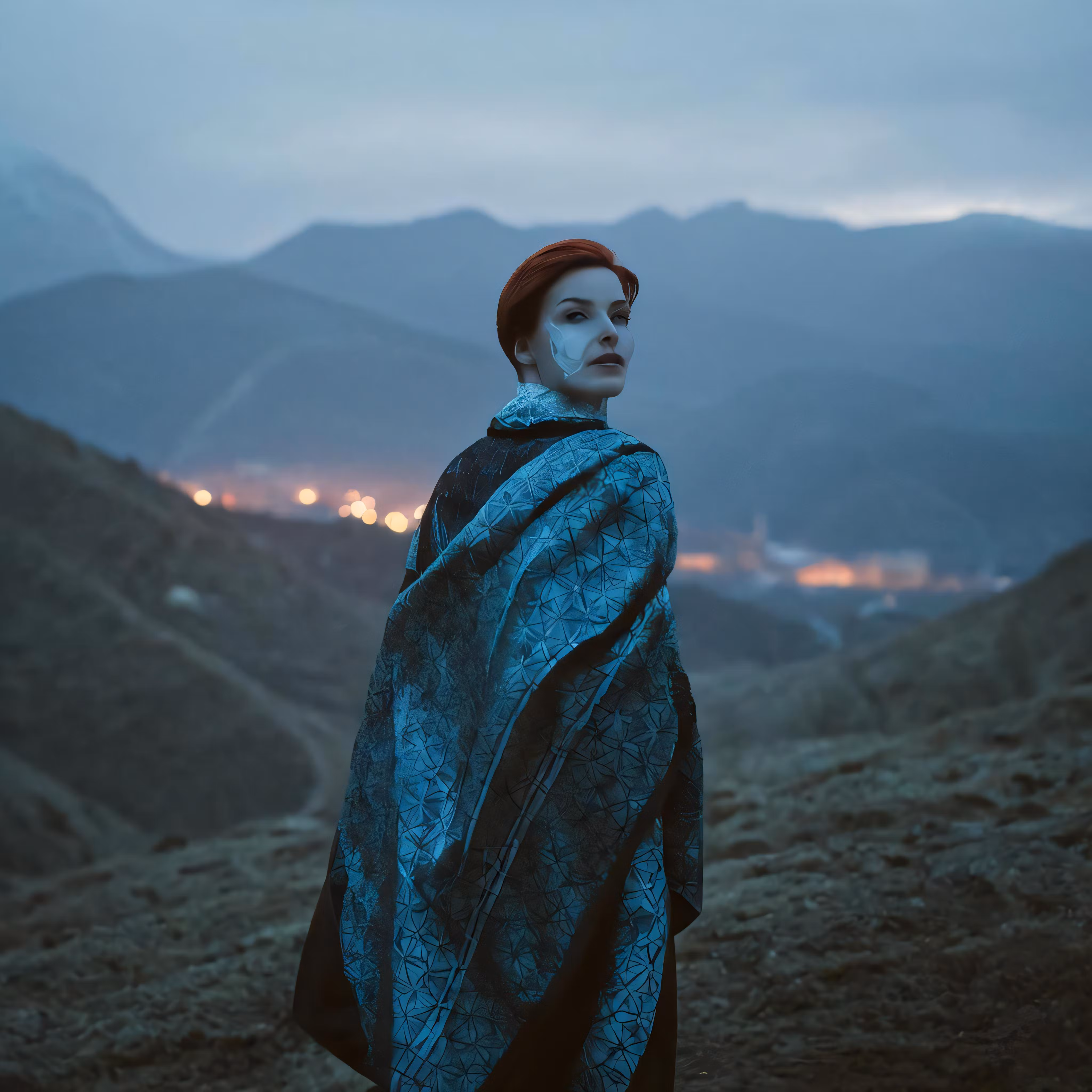 High resolution picture, free to use, a woman standing on top of a mountain under a blanket