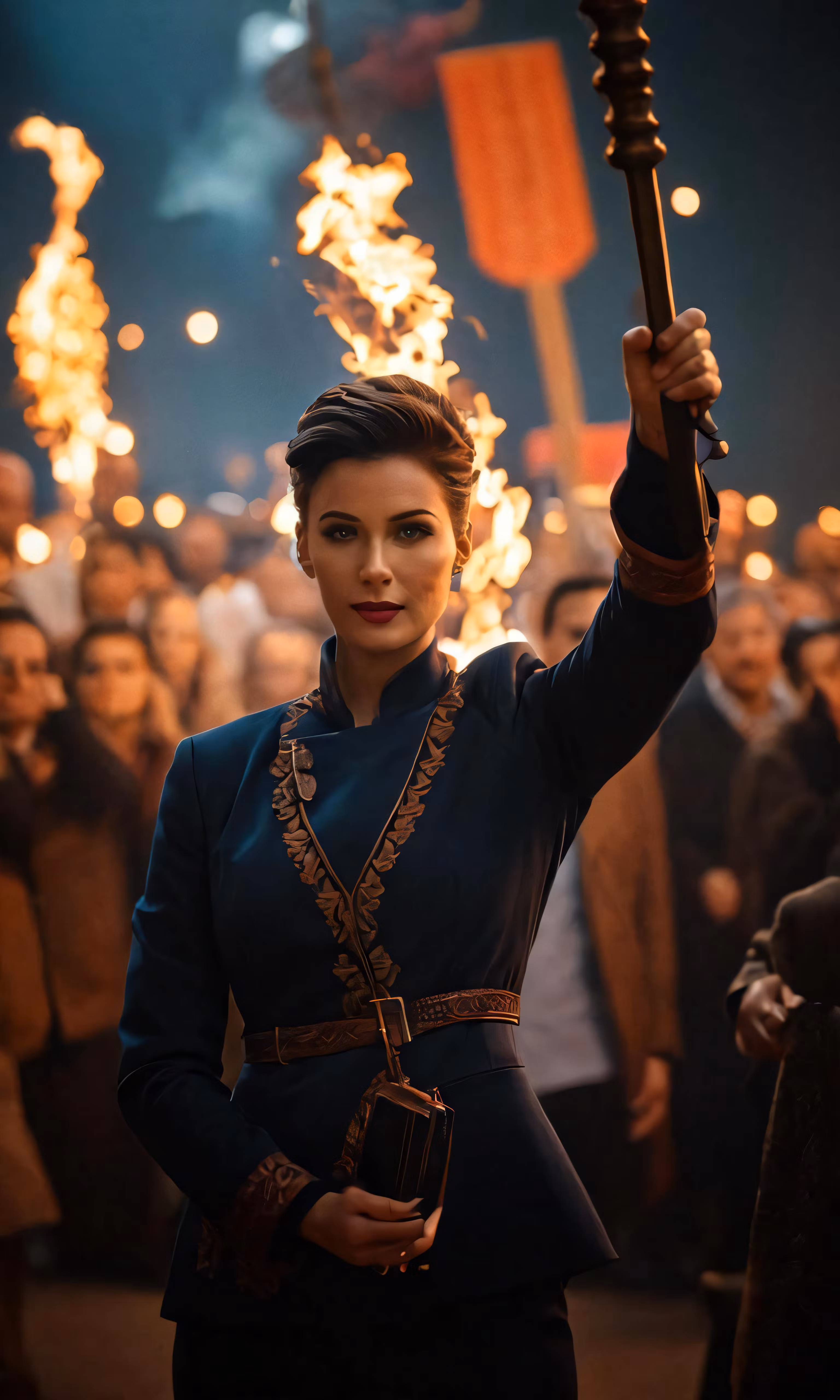High resolution picture, free to use, a woman standing on top of a stage holding onto an torches stick