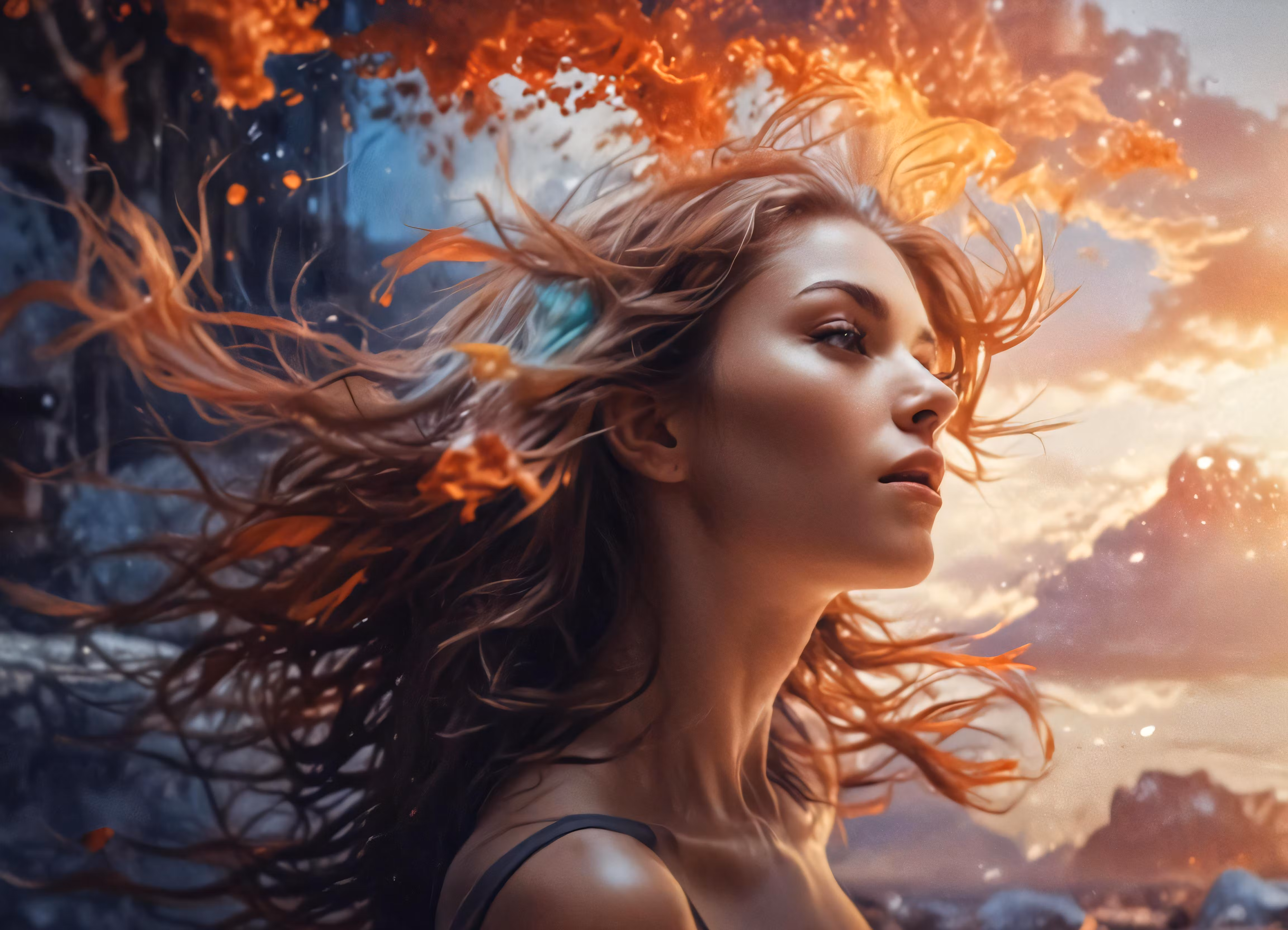 High resolution picture, free to use, a woman standing under a tree and blowing her hair