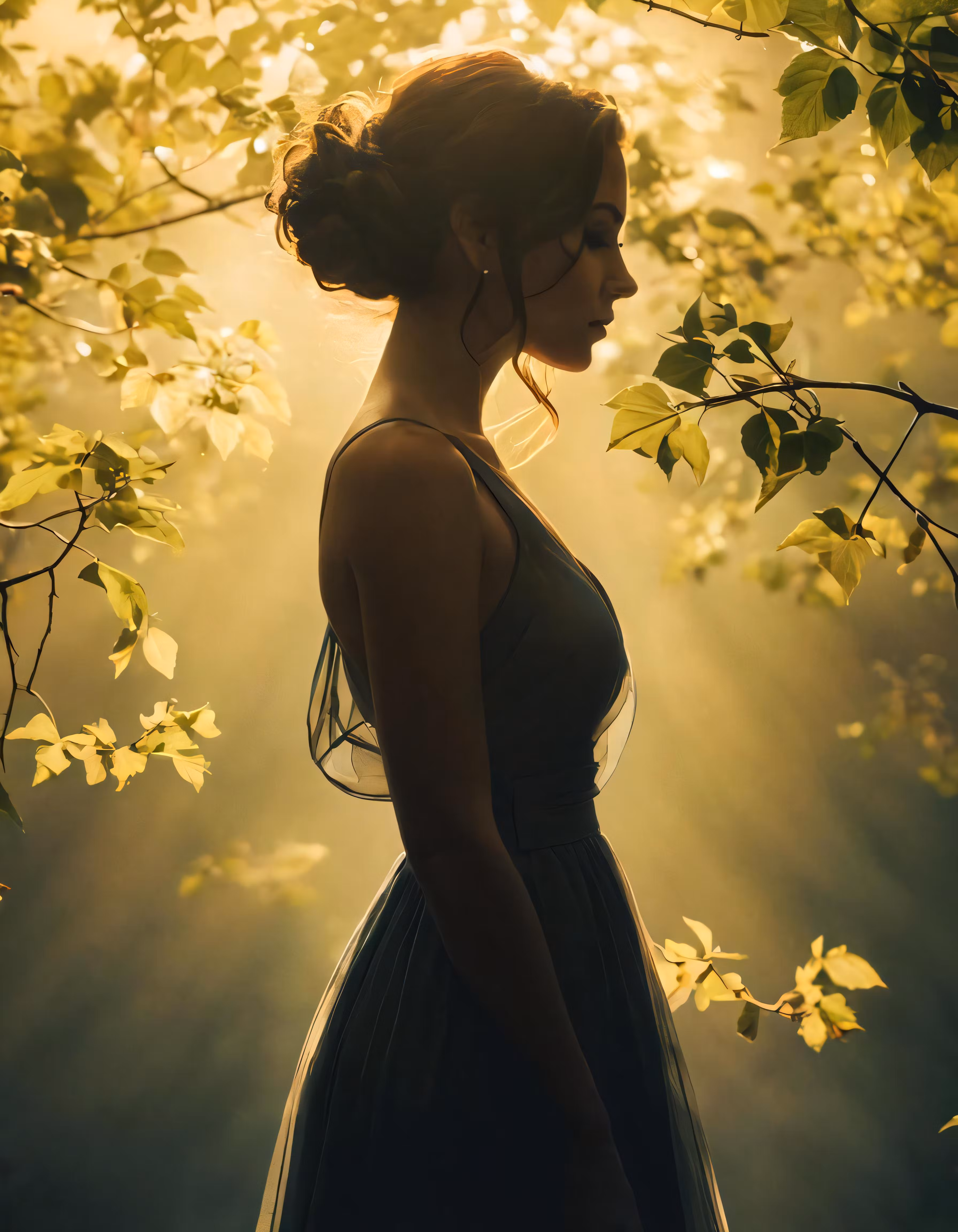 High resolution picture, free to use, a woman standing under trees looking down at leaves