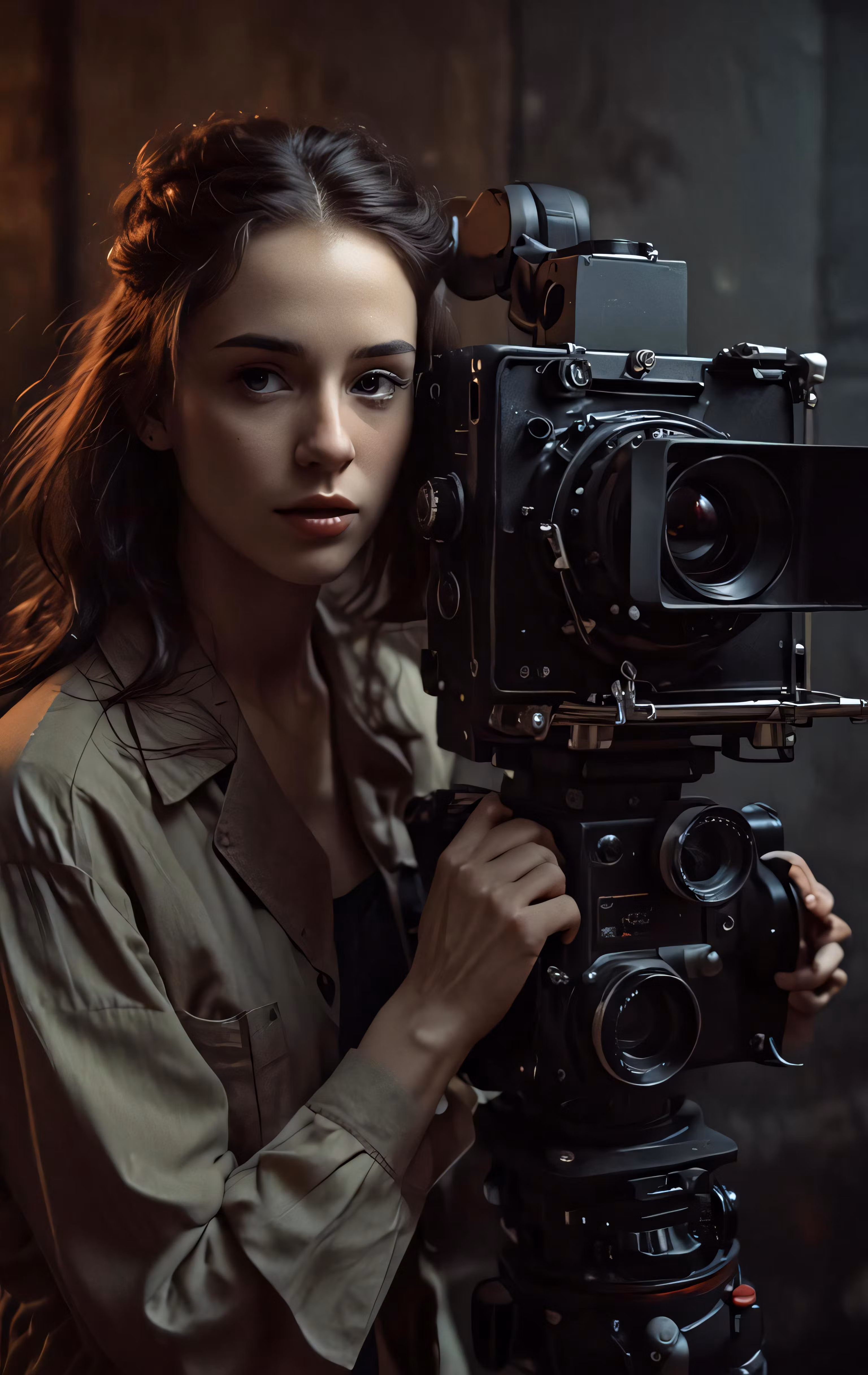 High resolution picture, free to use, a woman stands behind a camera posing for the camera
