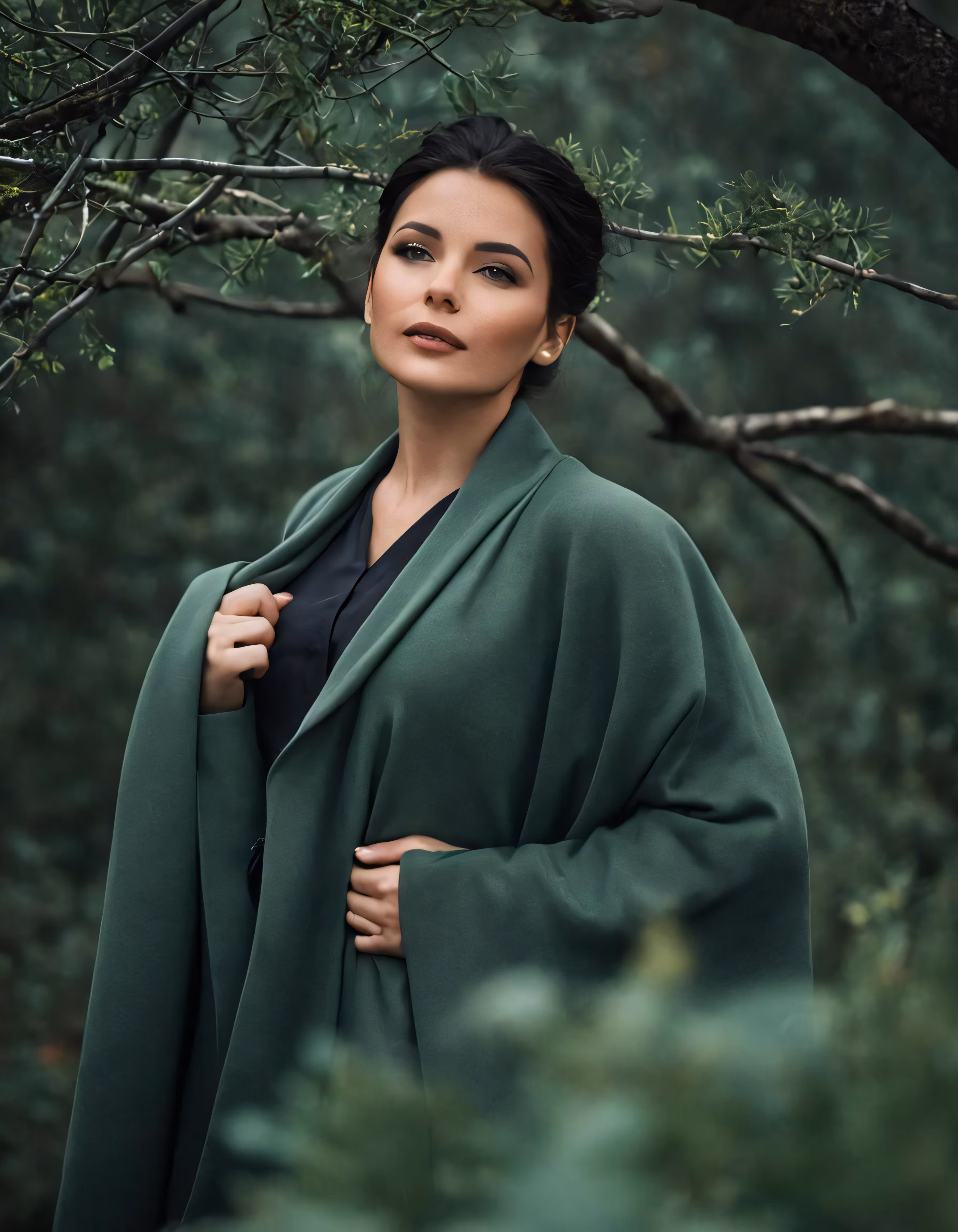 High resolution picture, free to use, a woman stands beneath a tree with a jacket on