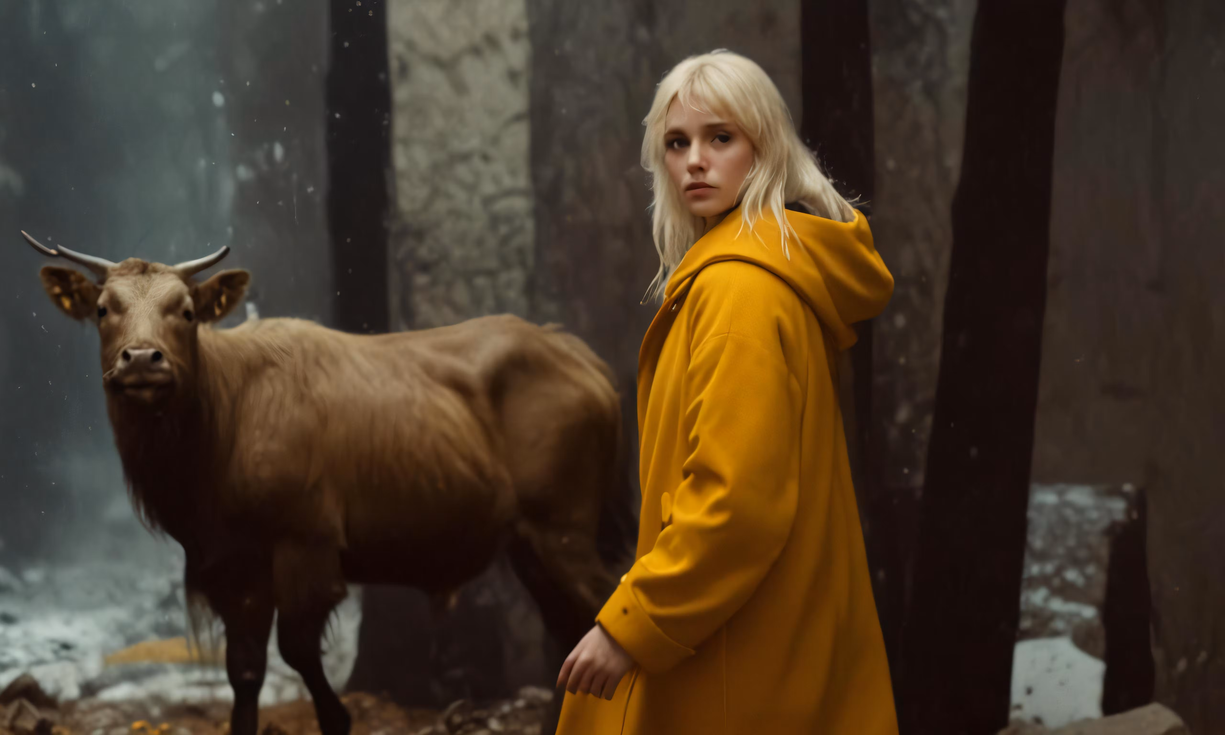 High resolution picture, free to use, a woman stands next to a large animal in a dark forest