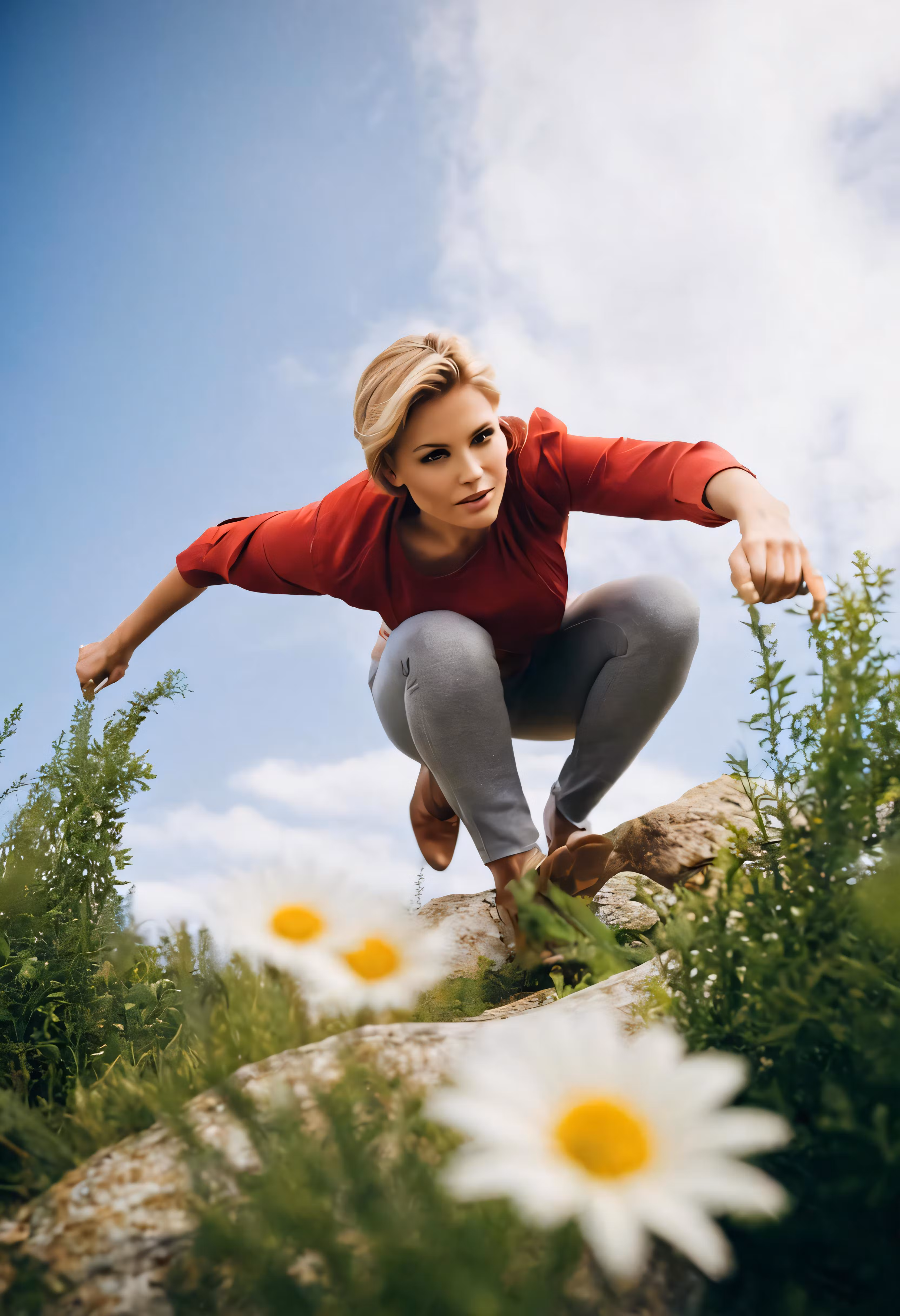 High resolution picture, free to use, a woman stands on a rocky hillside, holding her hands out in order to grab flowers