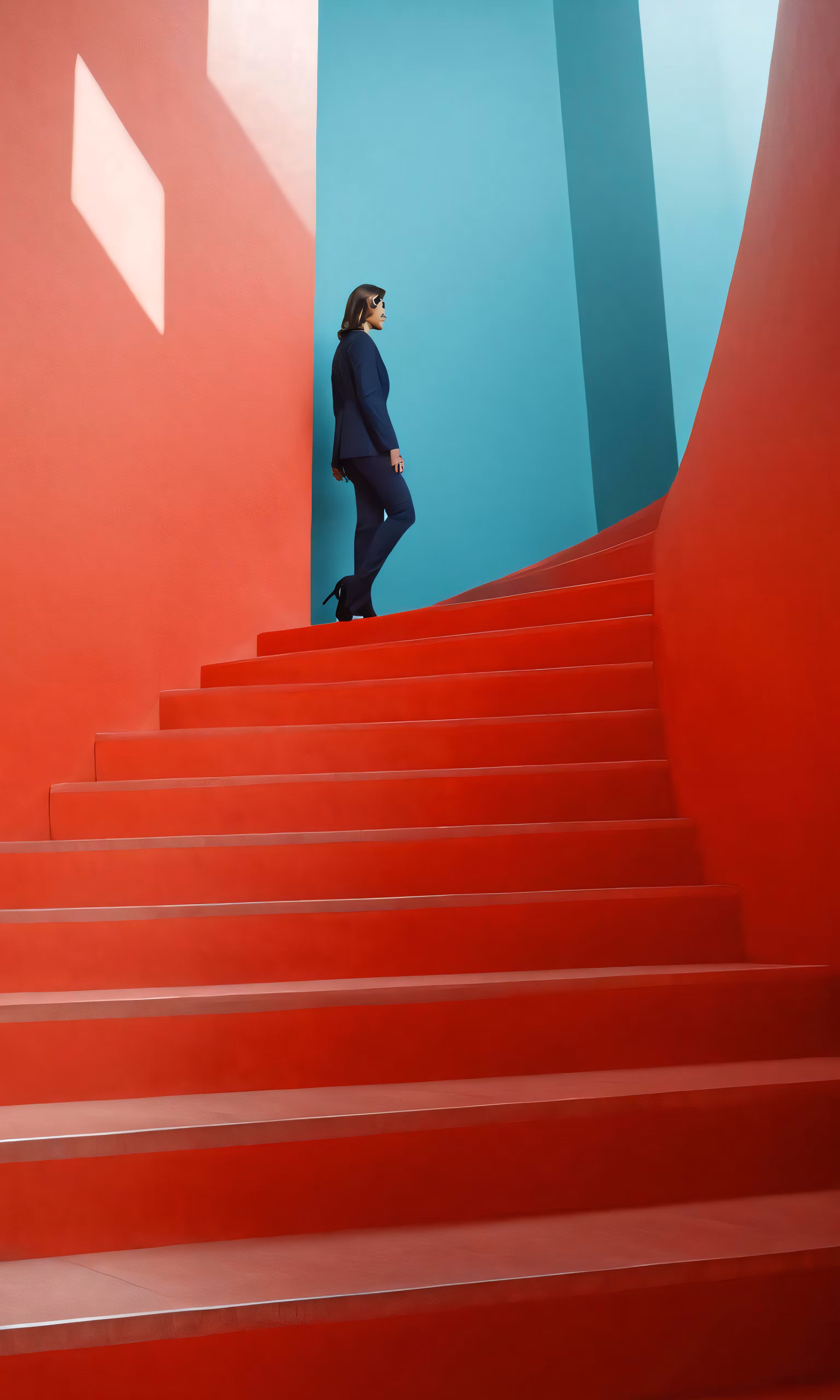 High resolution picture, free to use, a woman stands on a stair rail next to a bright red staircase