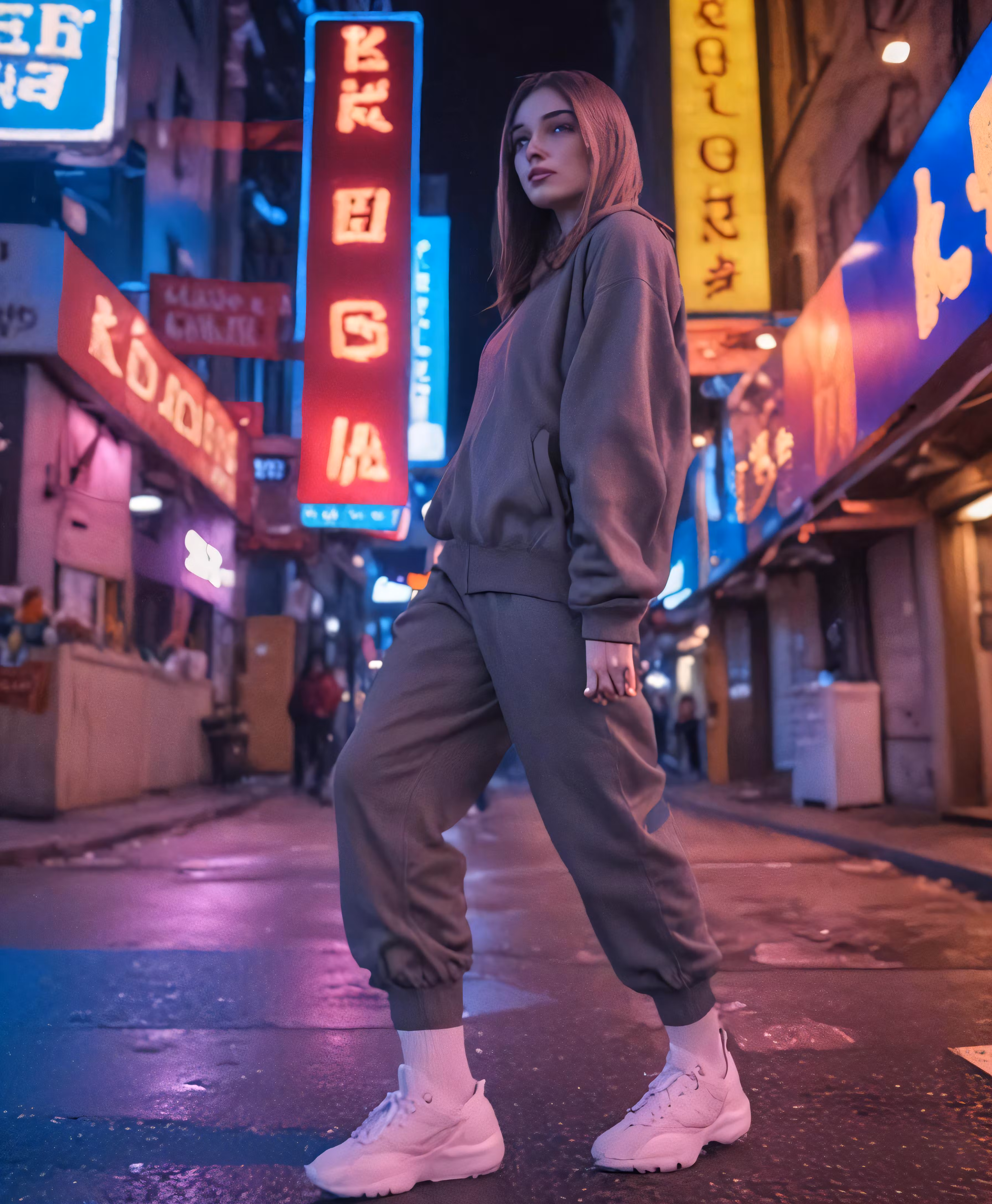 High resolution picture, free to use, a woman stands on the street near signs and buildings