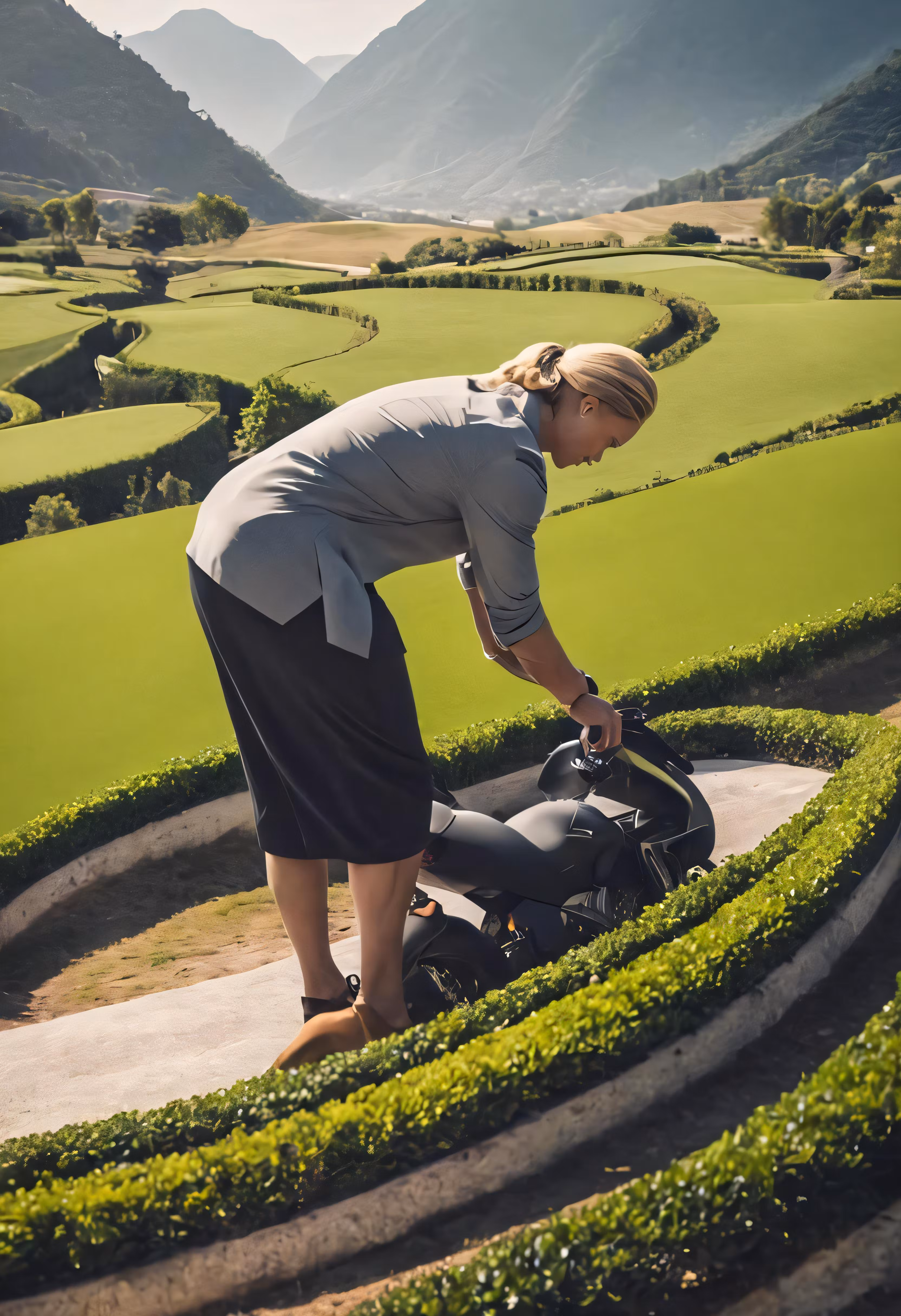 High resolution picture, free to use, a woman tending to her moped while on a beautiful day