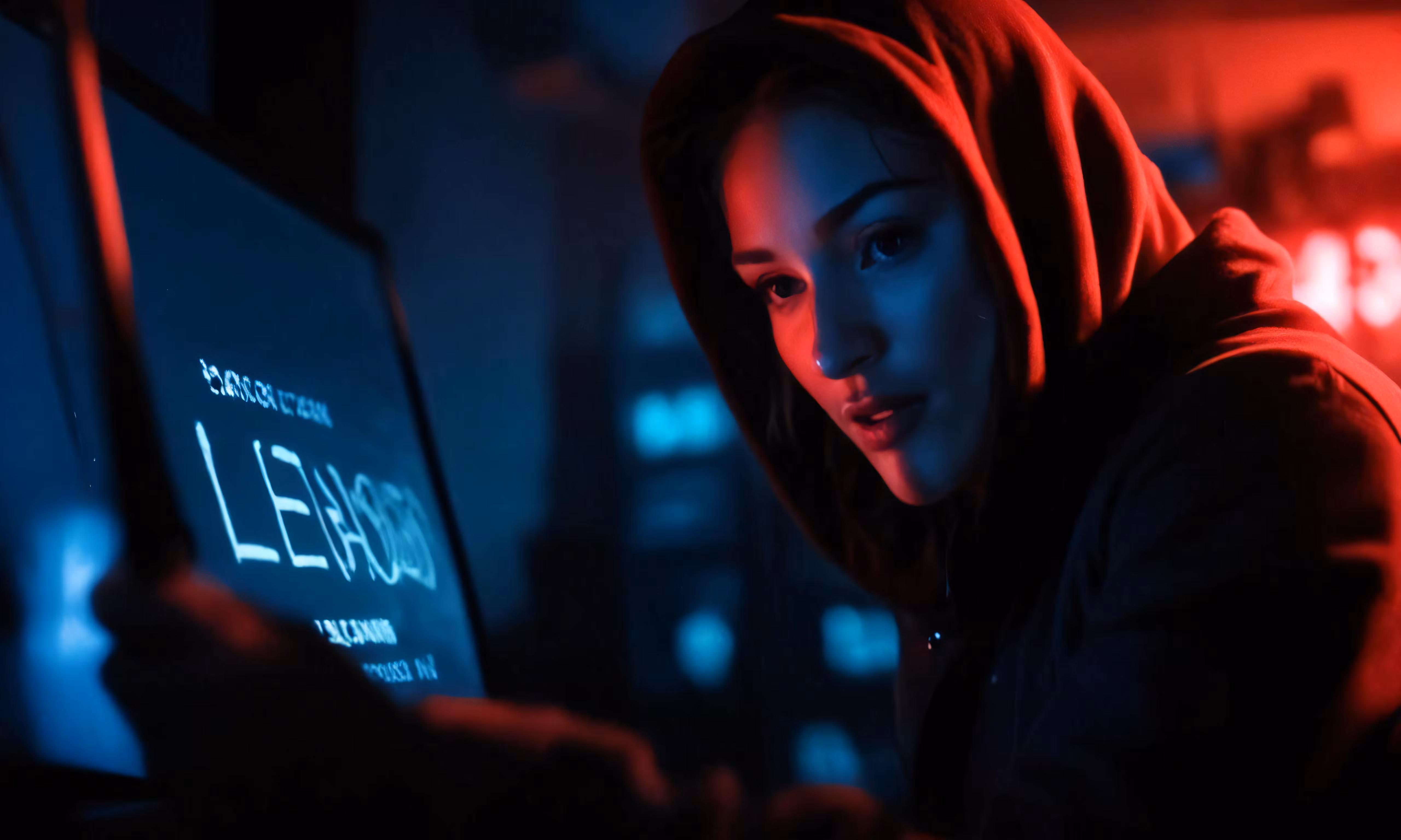 High resolution picture, free to use, a woman using a laptop at night with city lights
