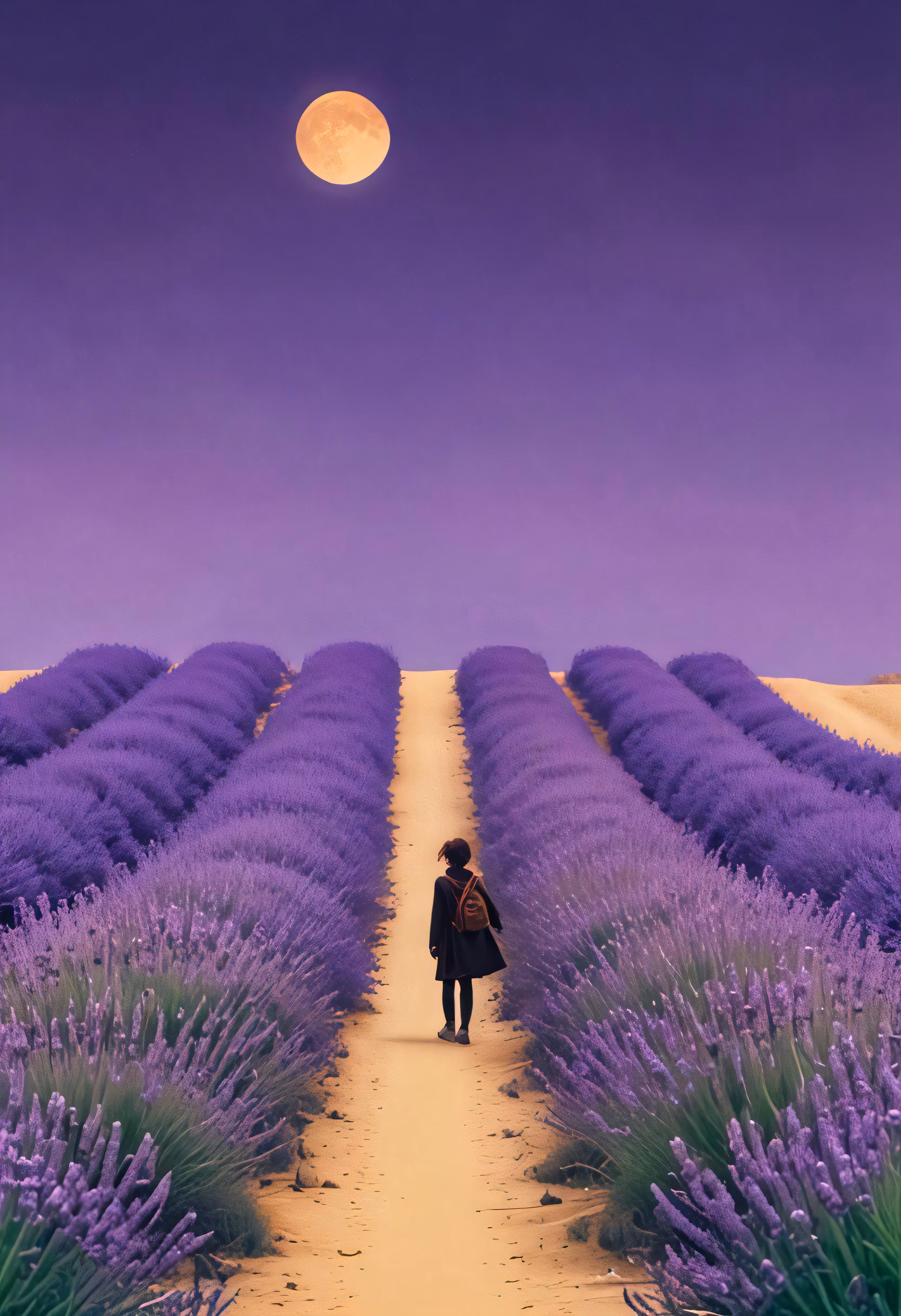 High resolution picture, free to use, a woman walking down a road lined with lots of lavender