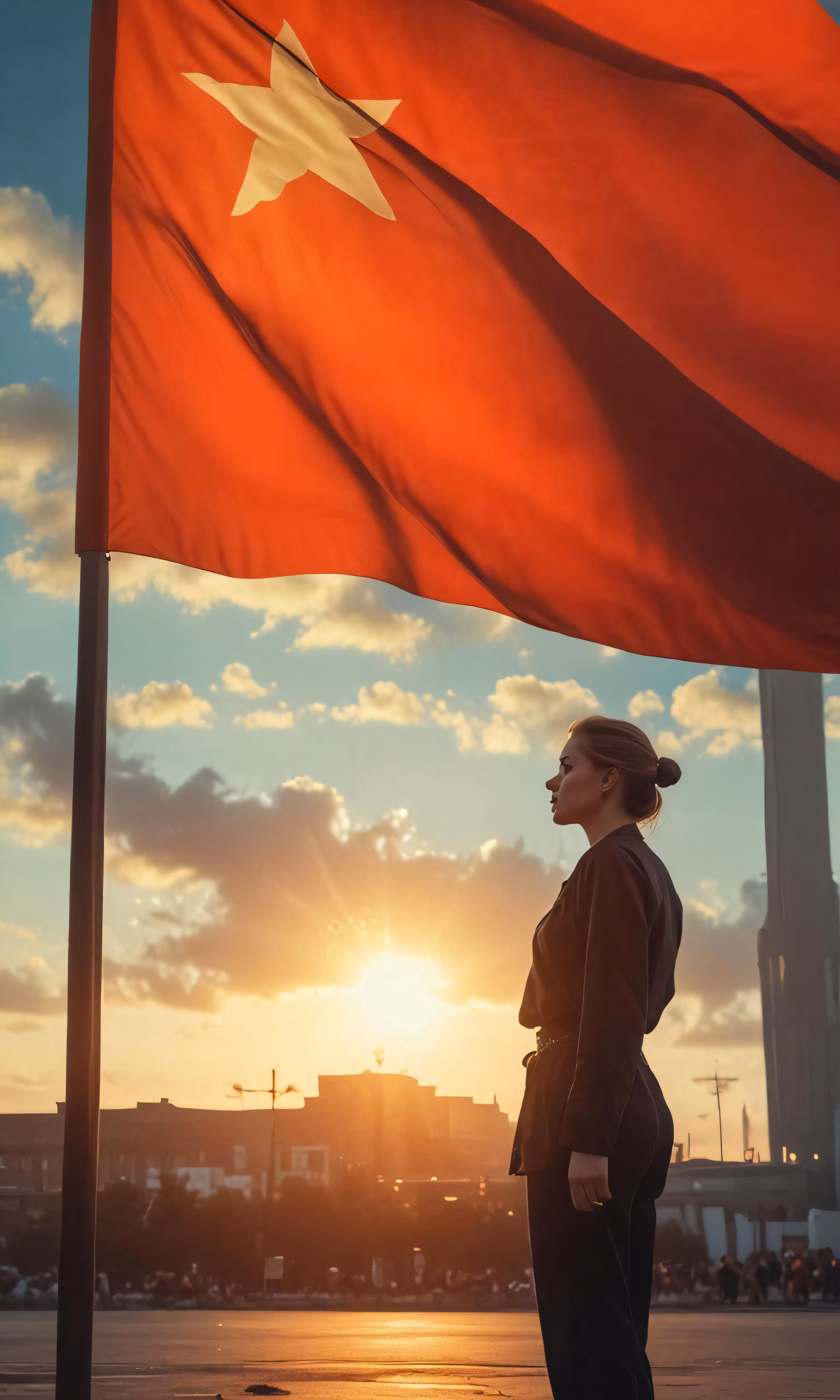 High resolution picture, free to use, a woman walking down a street past a large red flag