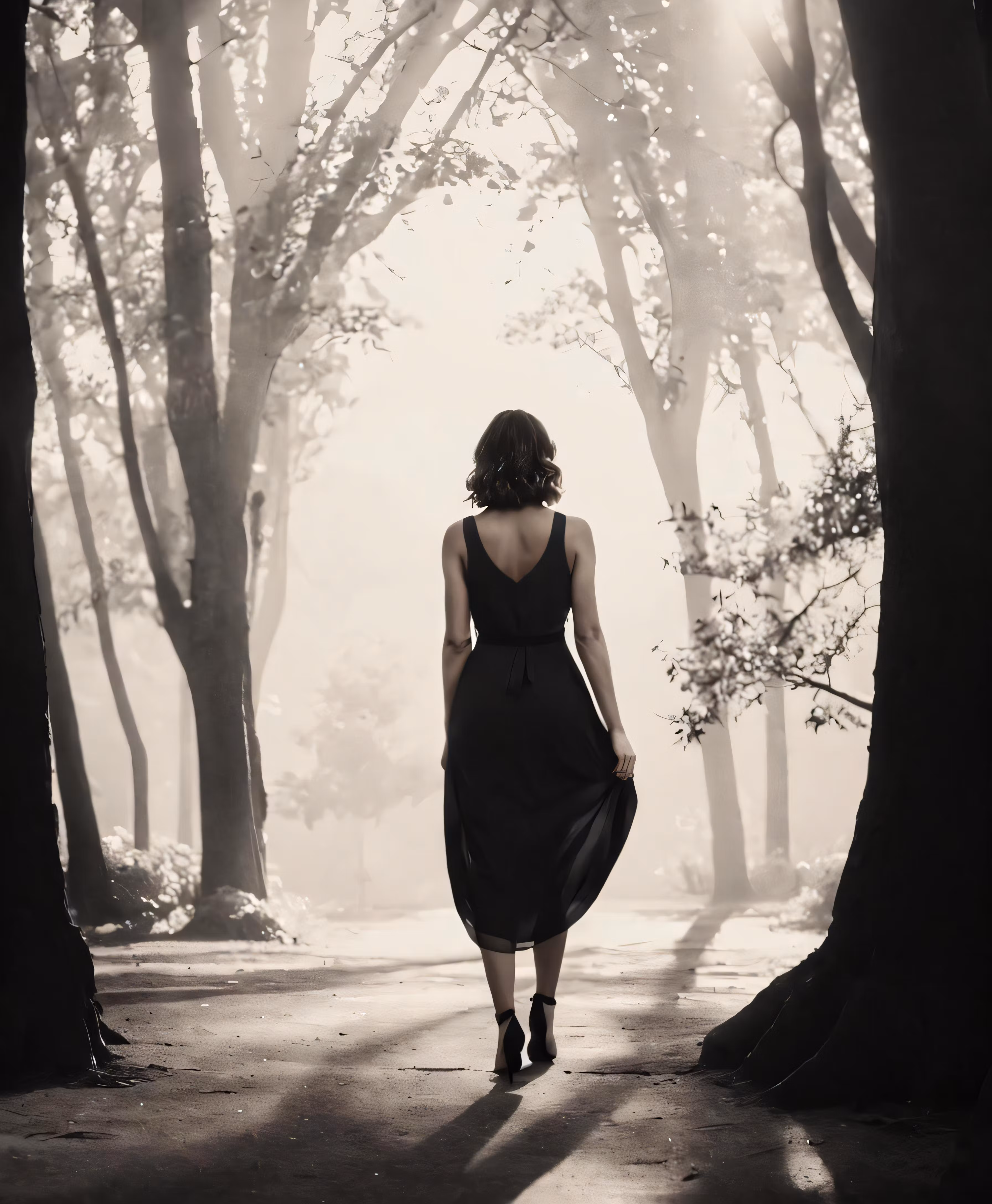 High resolution picture, free to use, a woman walking down a tree lined path