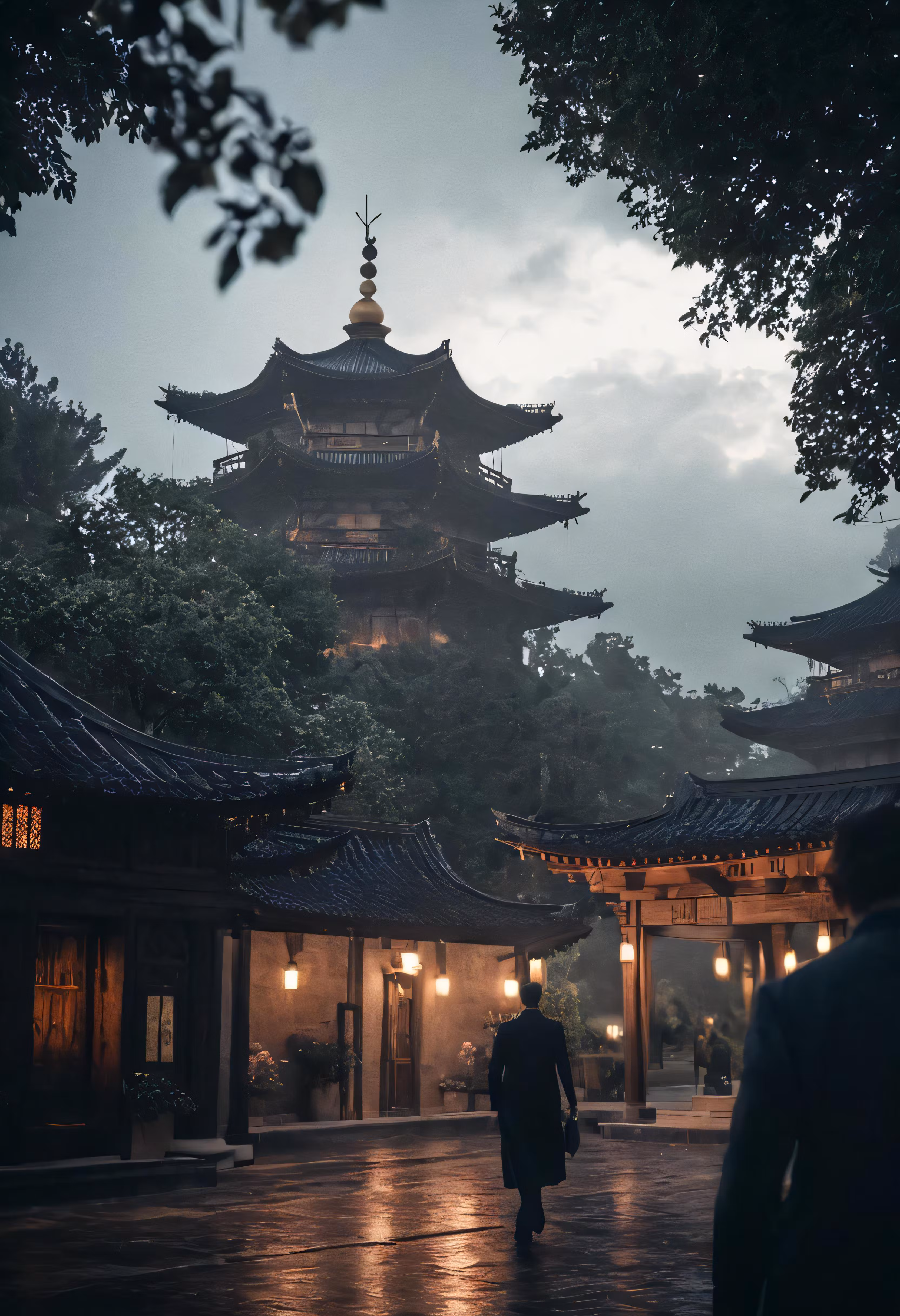 High resolution picture, free to use, a woman walking down a wet pathway in the rain at night