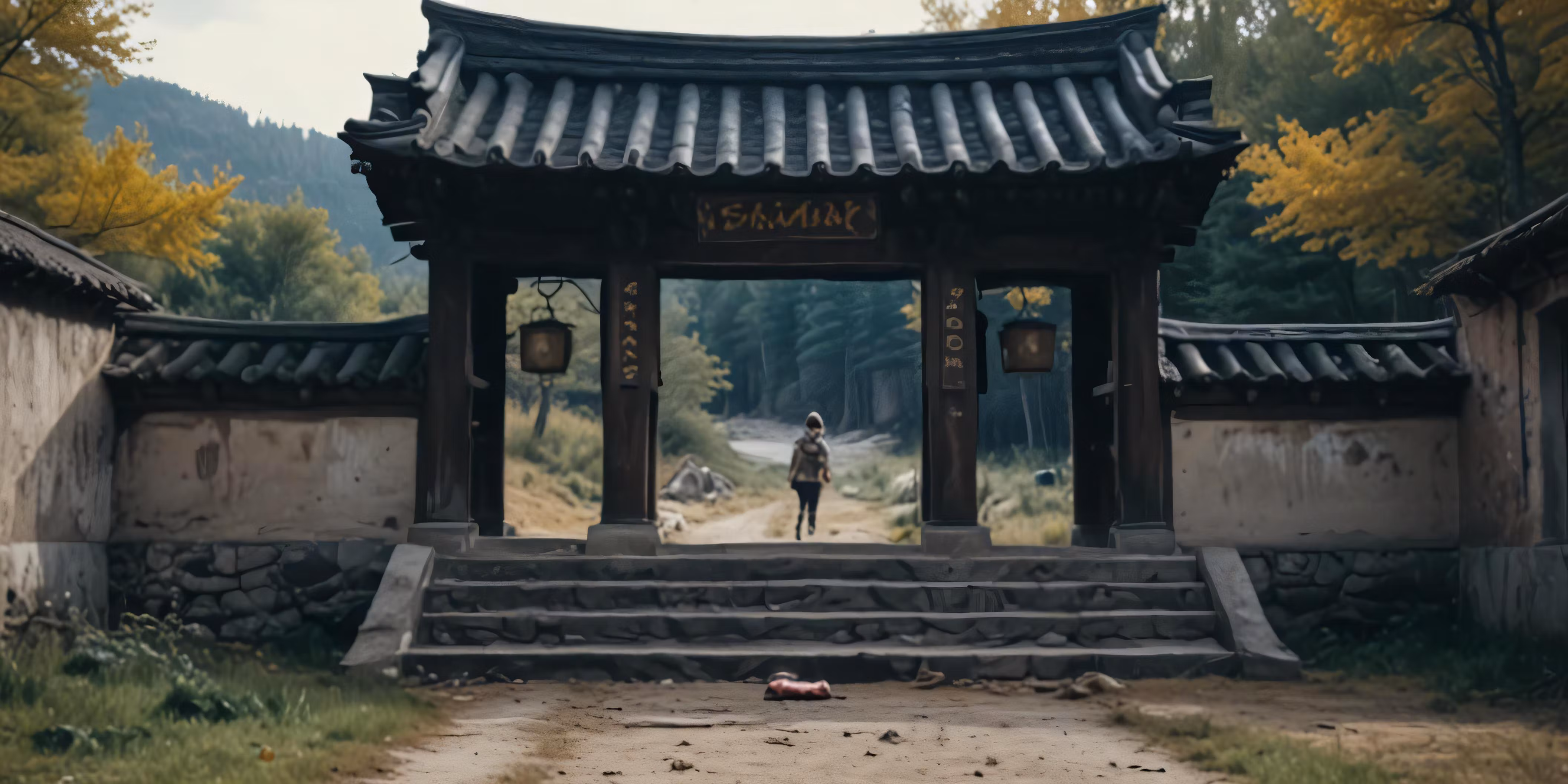 High resolution picture, free to use, a woman walking in front of an oriental   looking structure