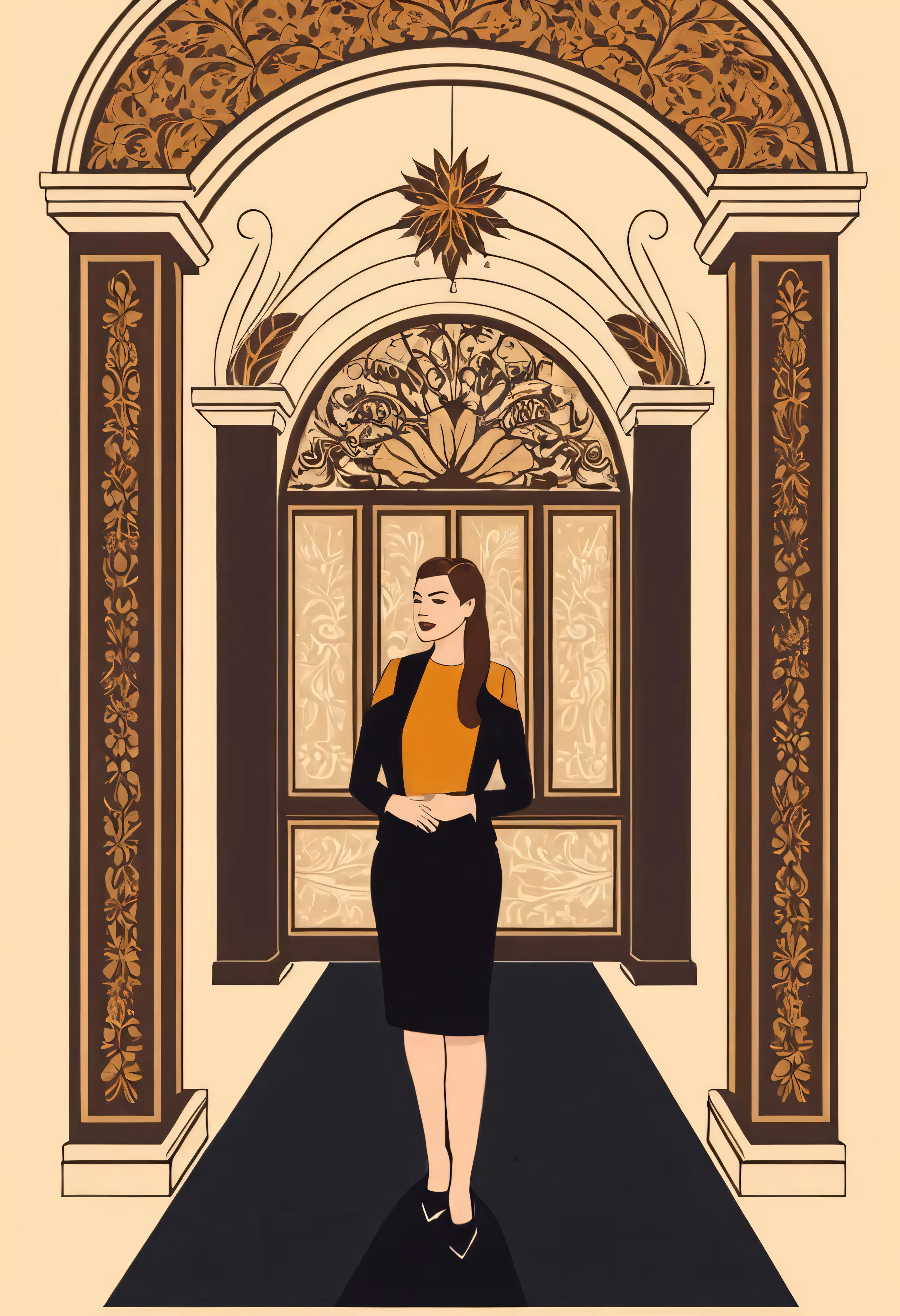 High resolution picture, free to use, a woman wearing a black and yellow dress and holding a red bag stands in front of an entrance way