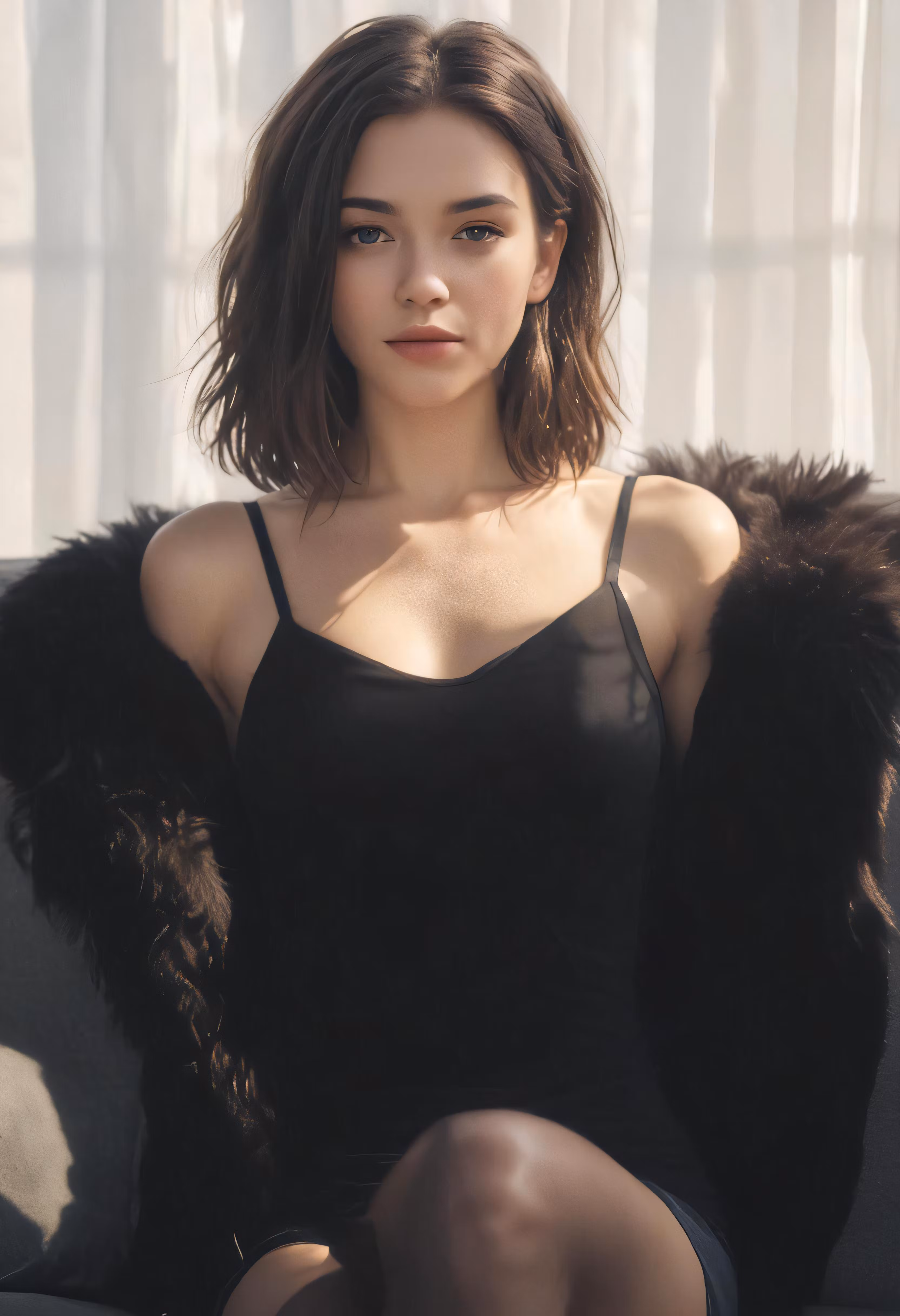 High resolution picture, free to use, a woman wearing a black dress sitting on a couch
