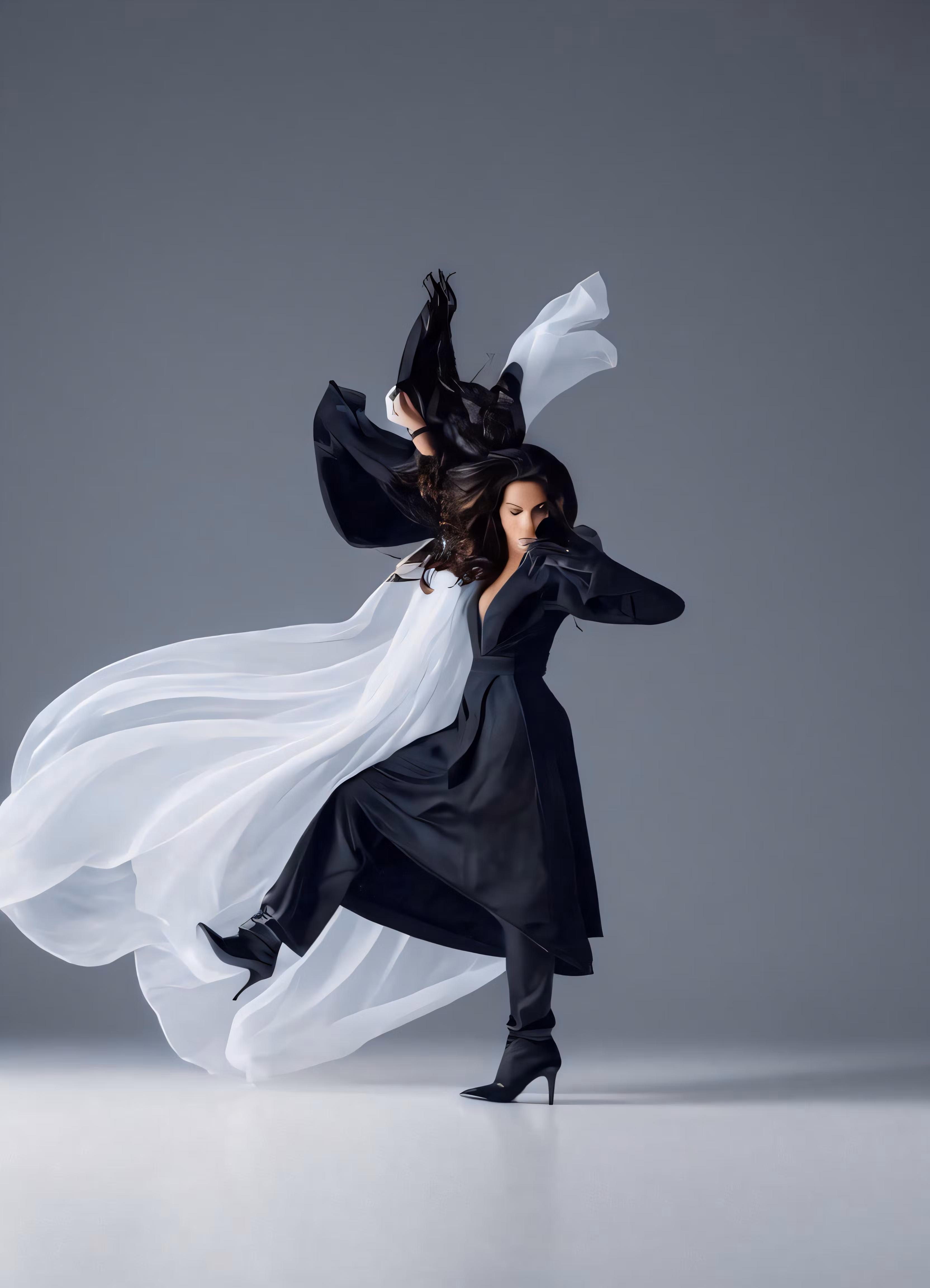 High resolution picture, free to use, a woman wearing a black suit and white dress is dancing