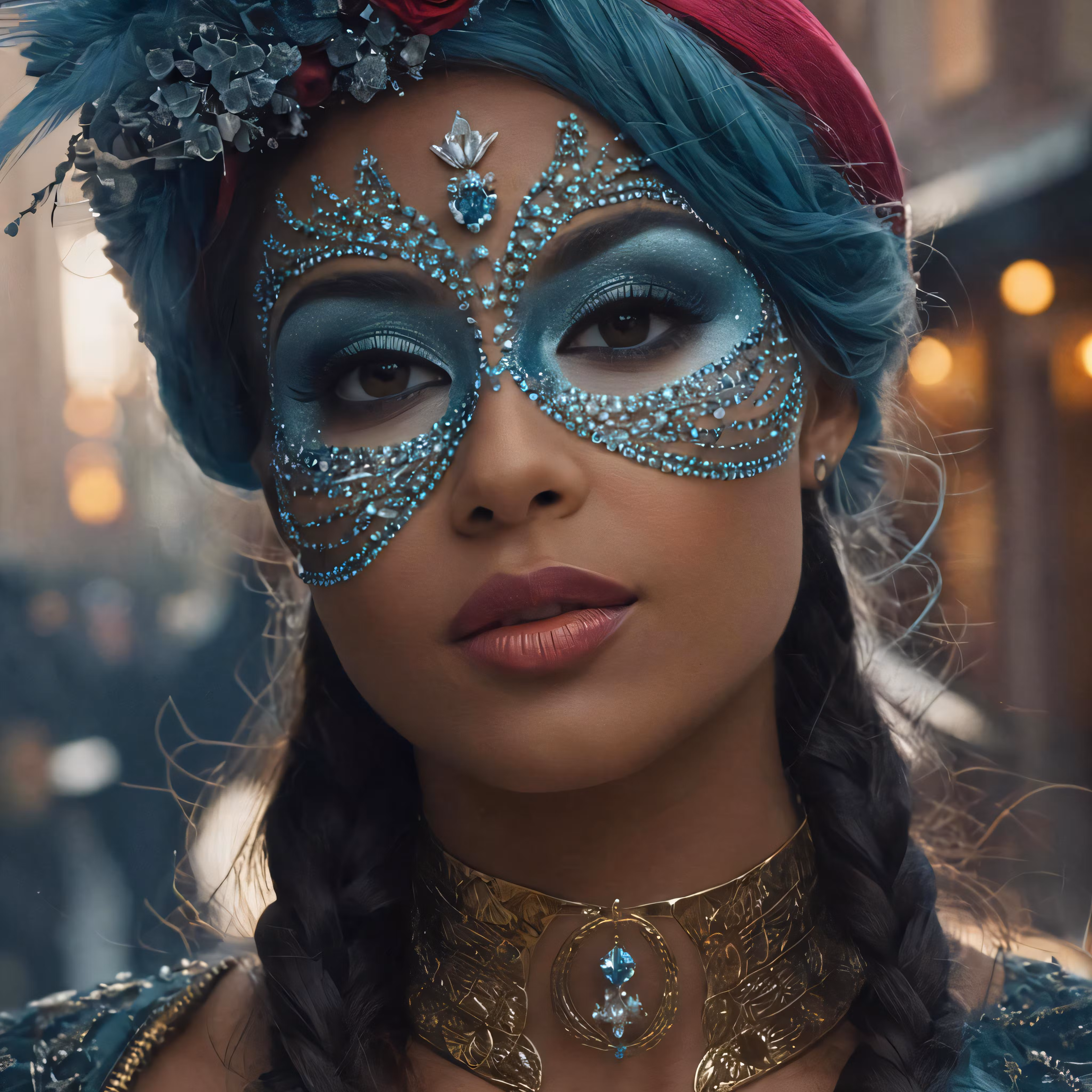 High resolution picture, free to use, a woman wearing a blue masquerade on her face