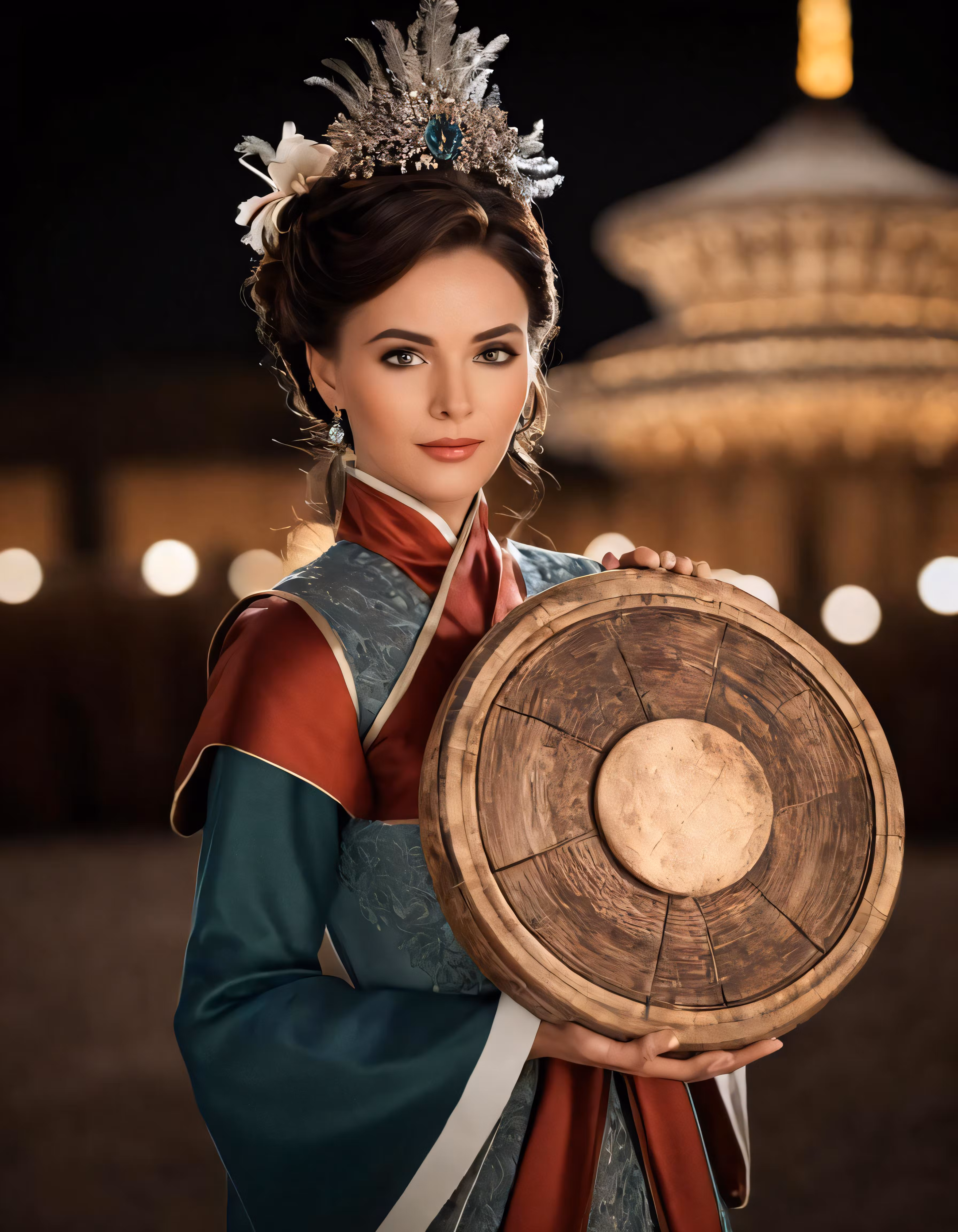 High resolution picture, free to use, a woman wearing a costume holds onto a wooden object