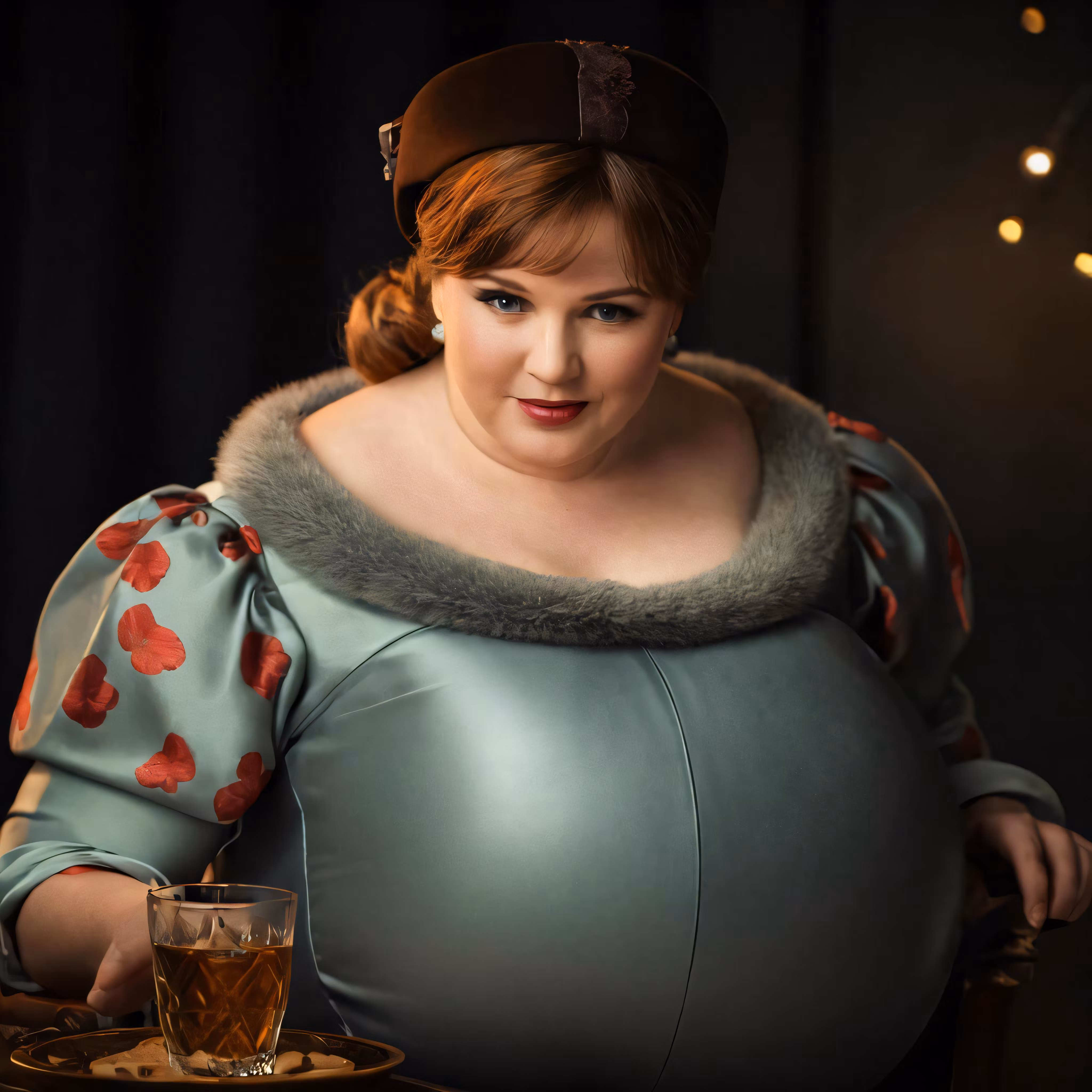 High resolution picture, free to use, a woman wearing a fat outfit is sitting down in a chair with a glass of whiskey