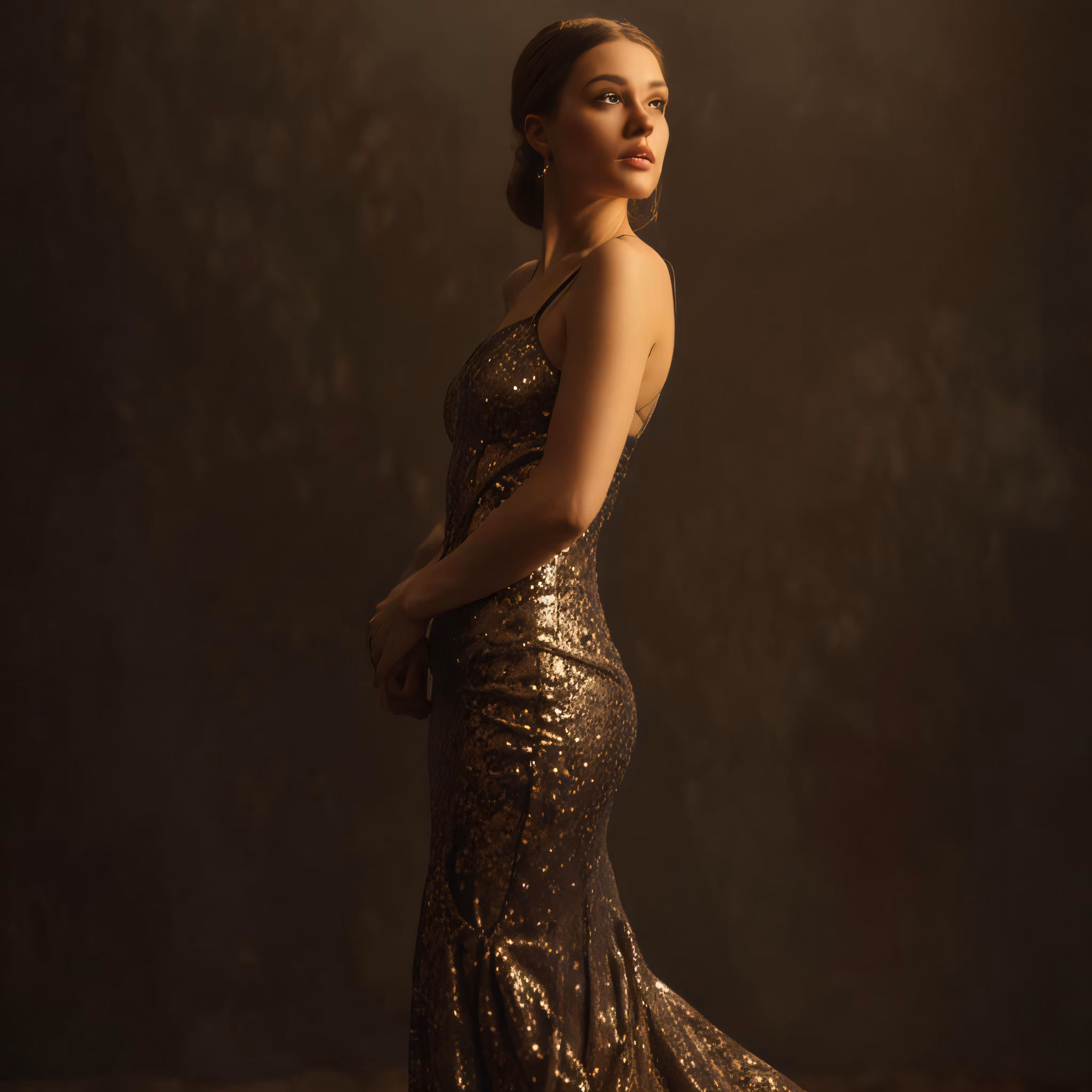 High resolution picture, free to use, a woman wearing a gold gown with a long train