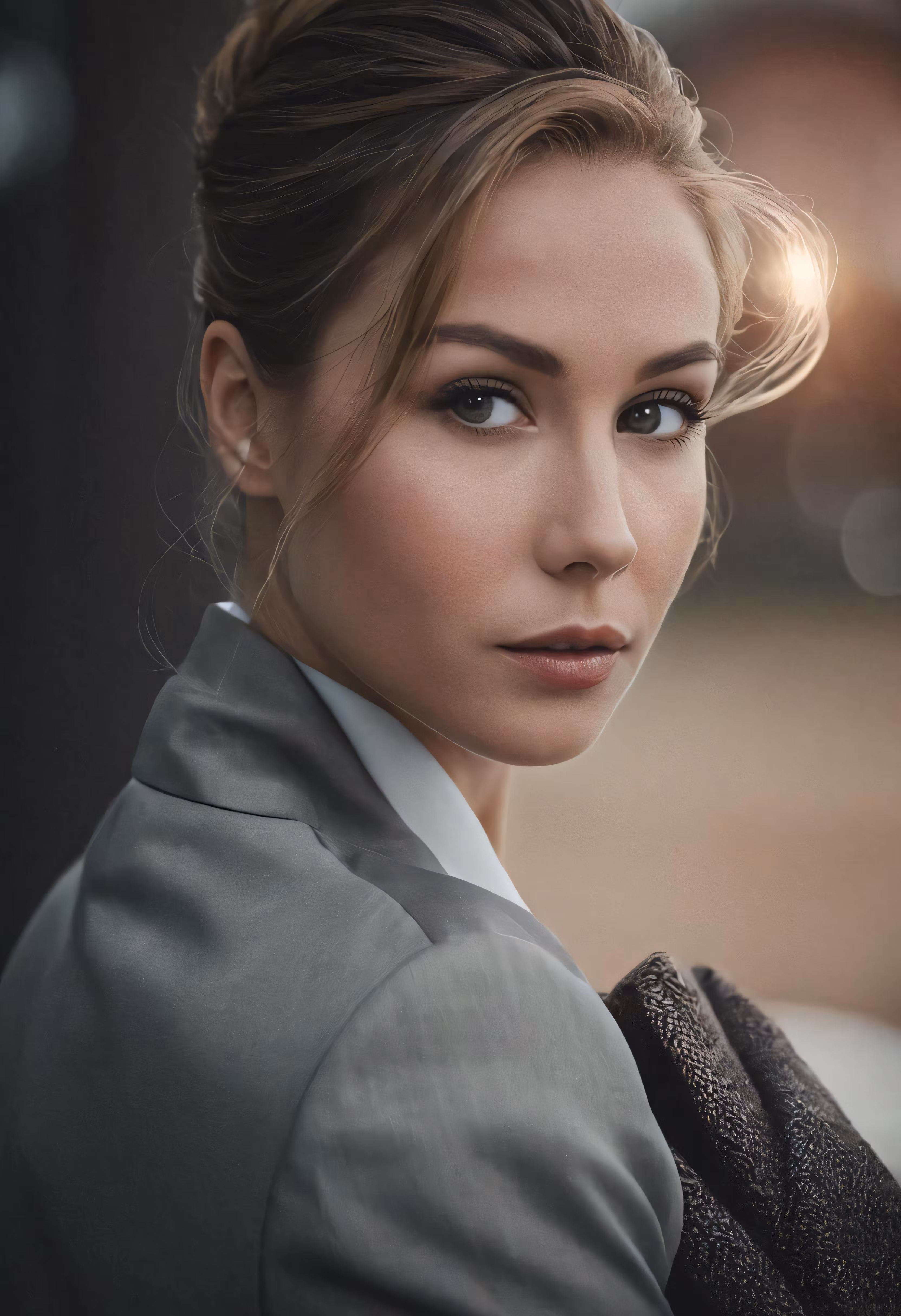 High resolution picture, free to use, a woman wearing a gray suit and a white shirt