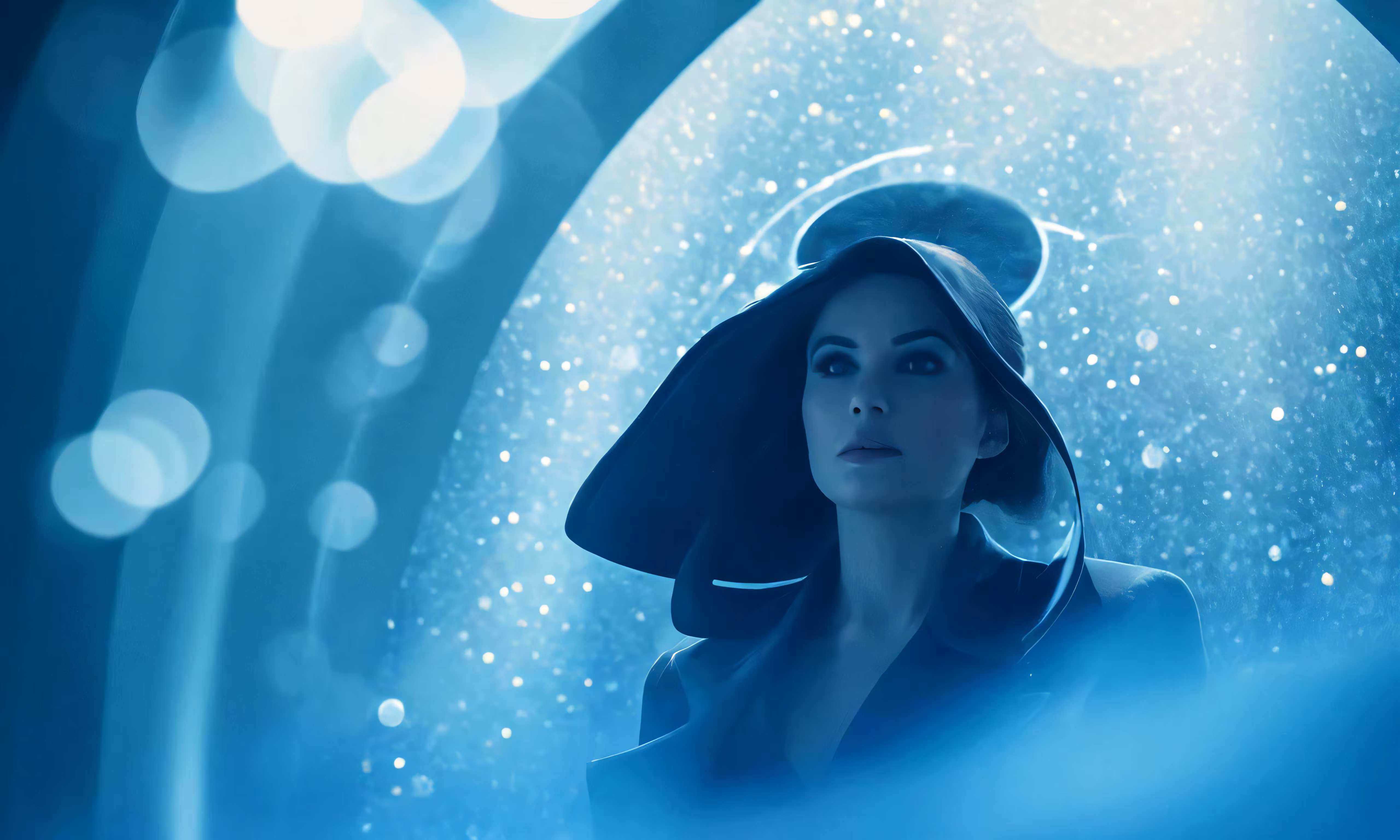 High resolution picture, free to use, a woman wearing a hat and rain jacket stands in front of a blue light