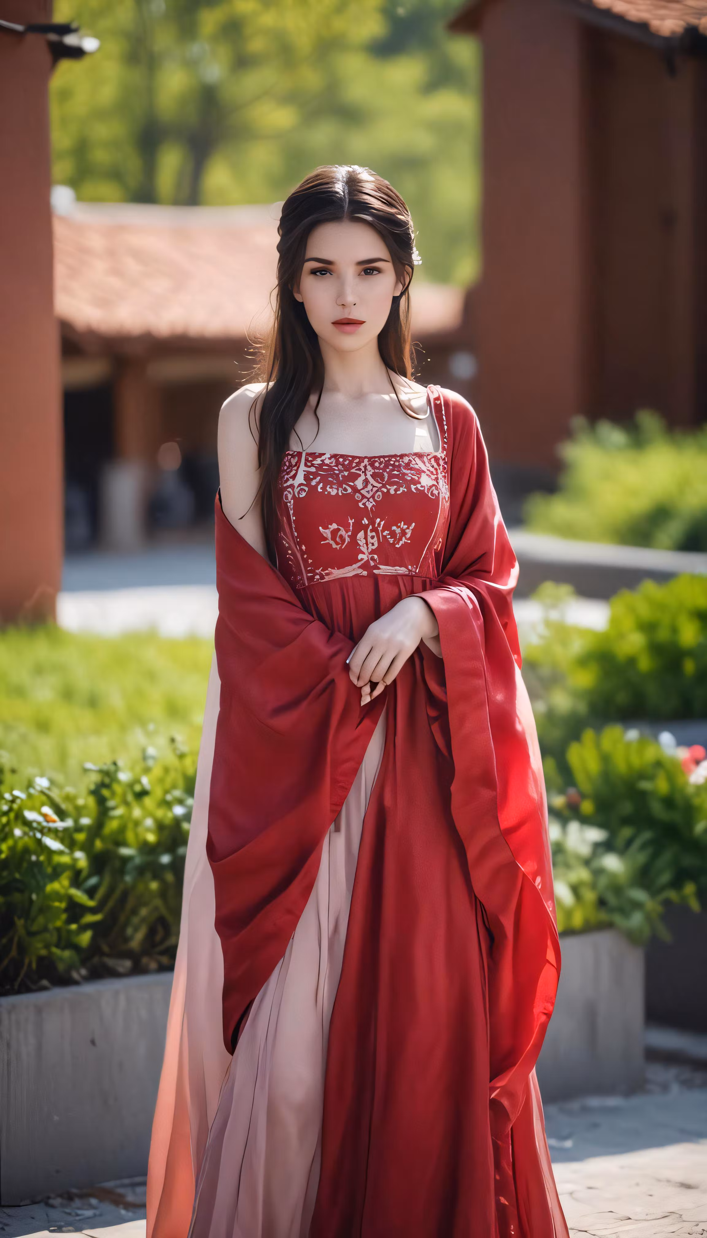 High resolution picture, free to use, a woman wearing a red and beige dress