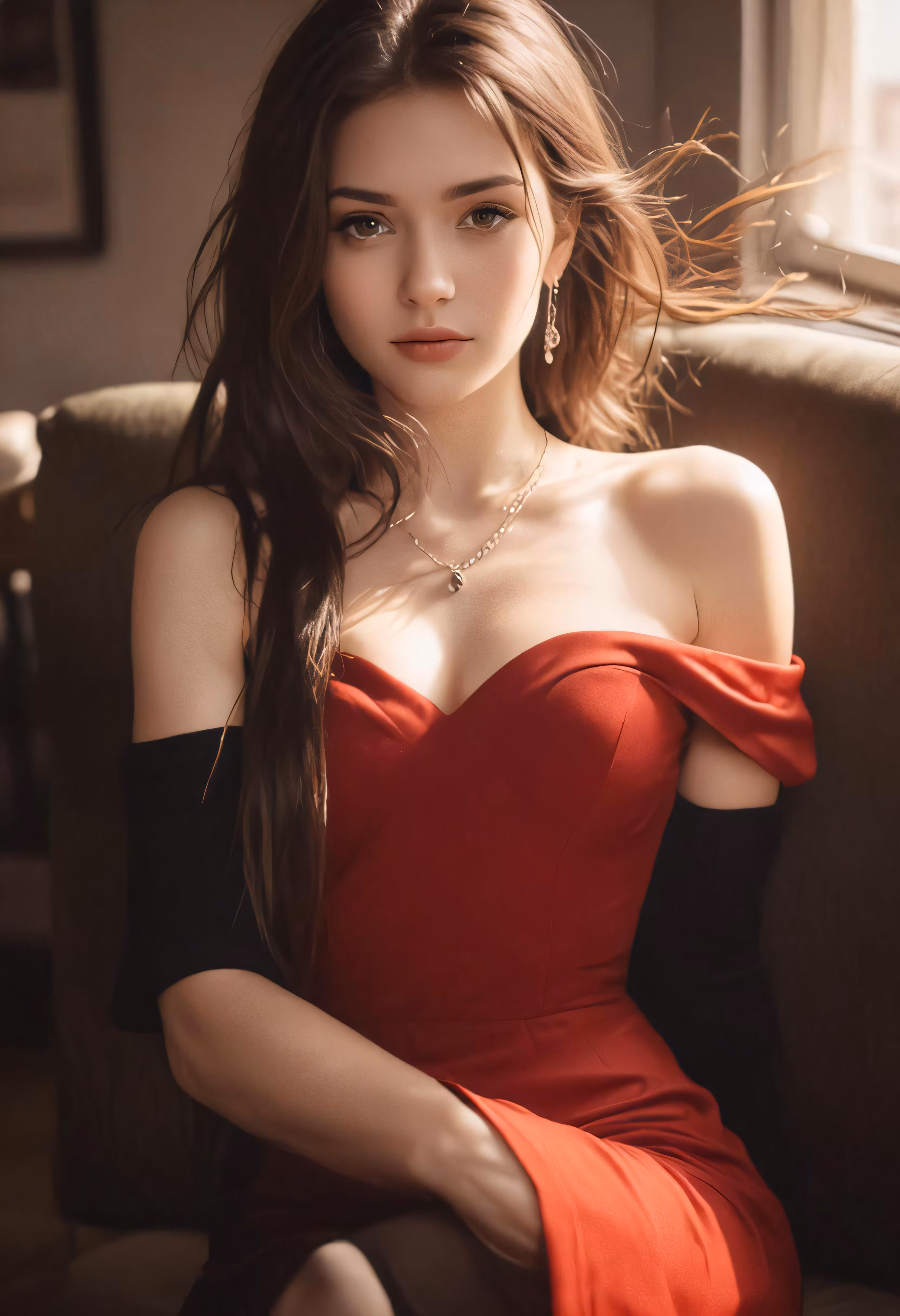 High resolution picture, free to use, a woman wearing a red dress is sitting in a chair
