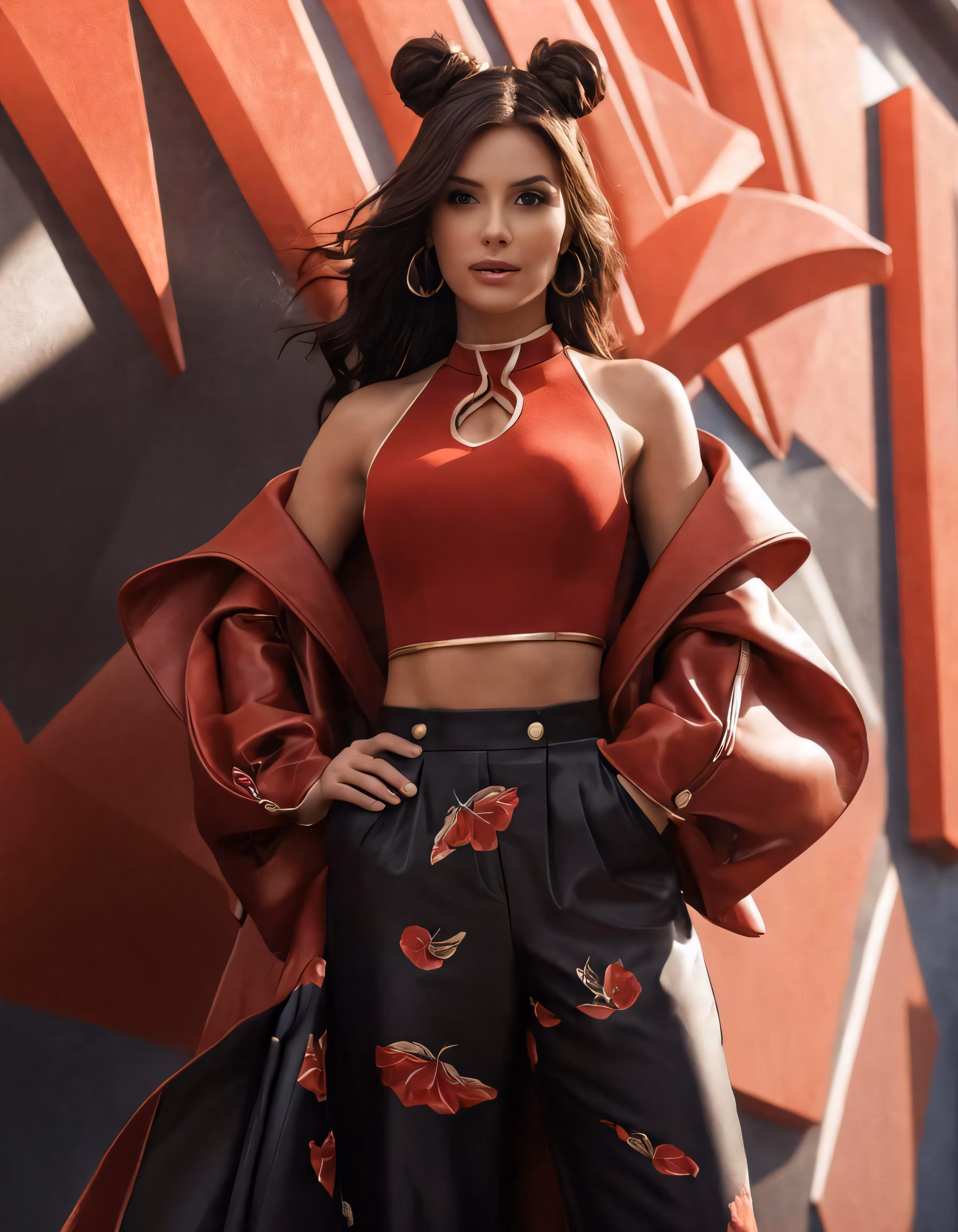 High resolution picture, free to use, a woman wearing a red top with a high   low skirt