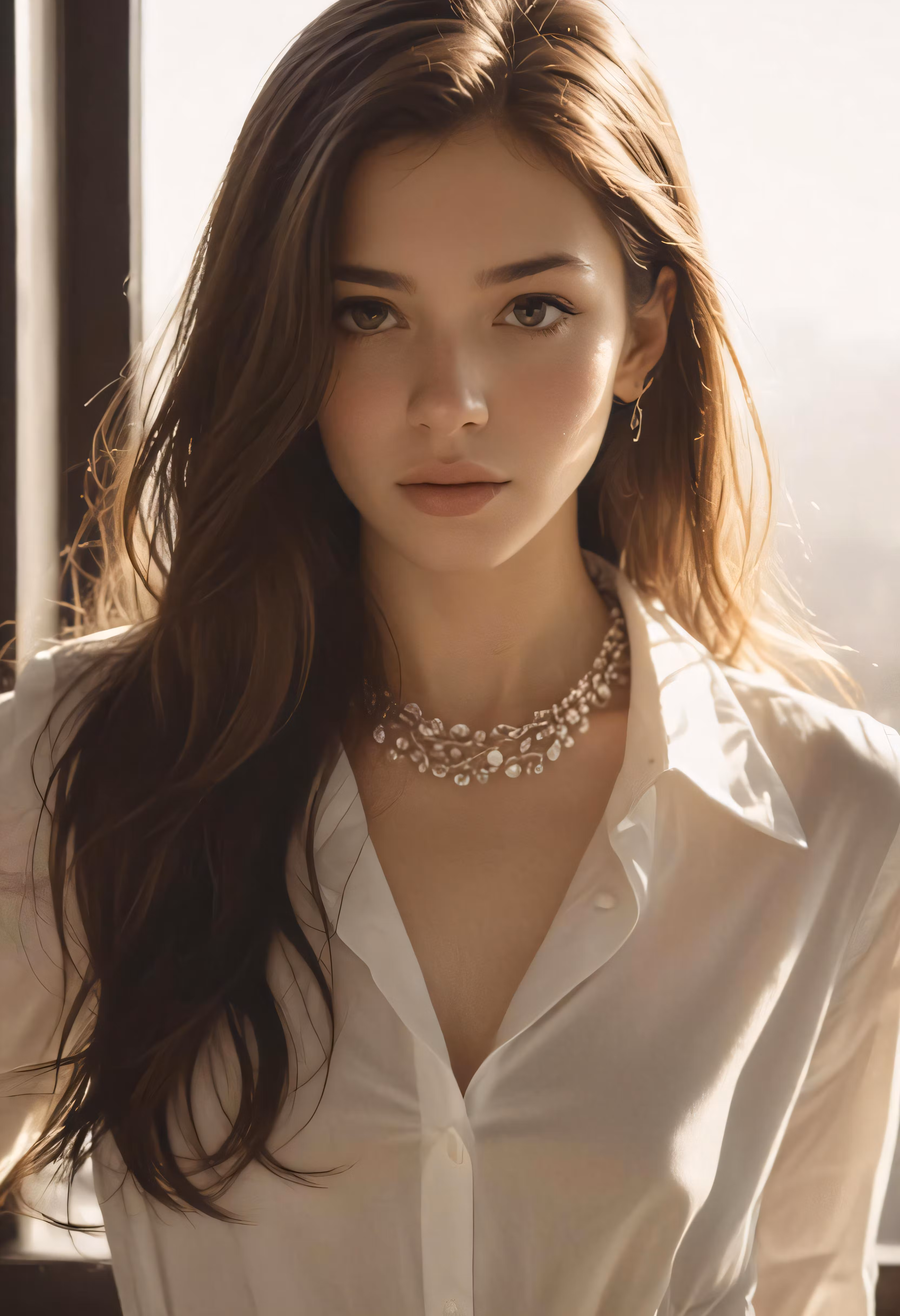 High resolution picture, free to use, a woman wearing a shirt and necklace standing next to a window