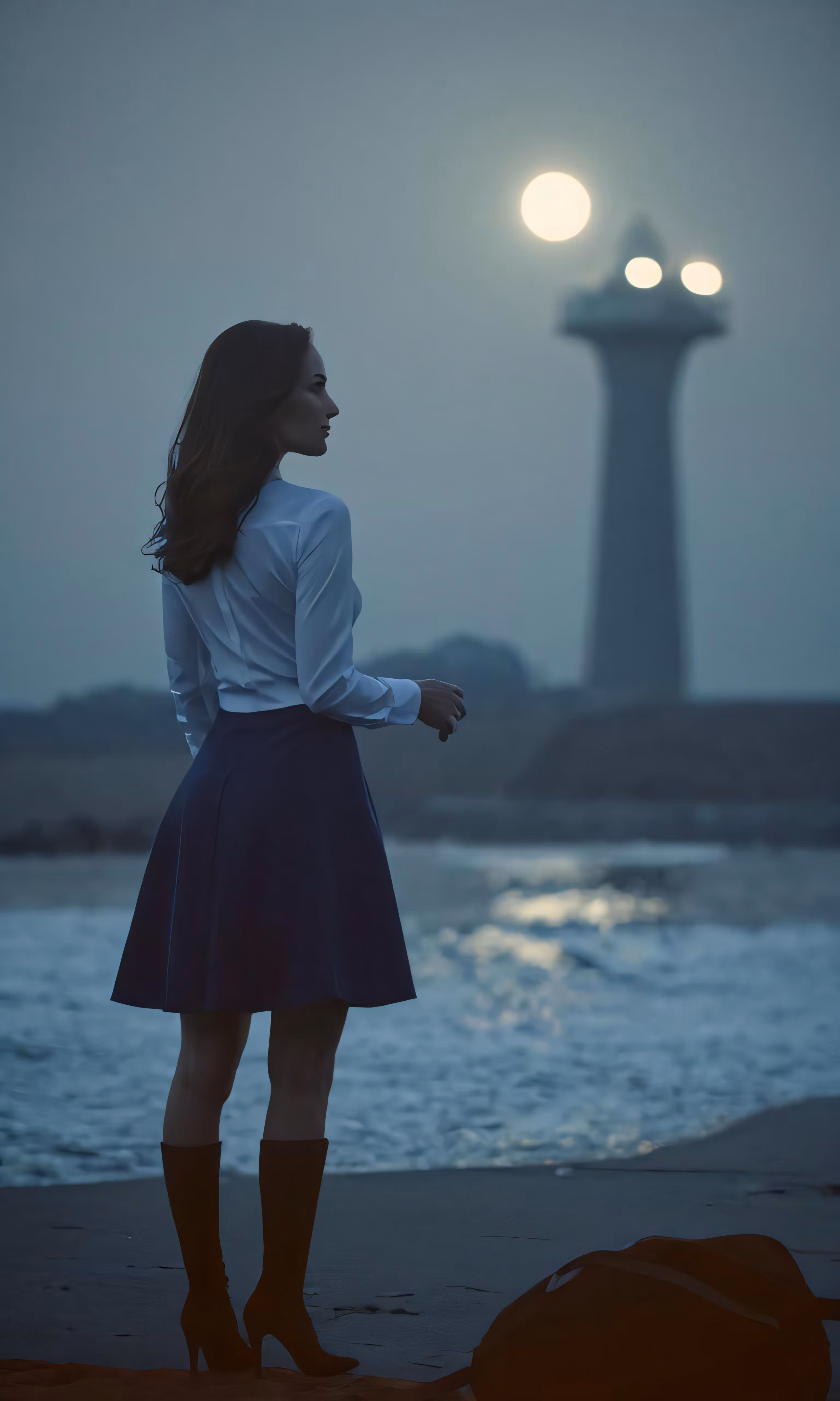 High resolution picture, free to use, a woman wearing a skirt and boots standing on the beach