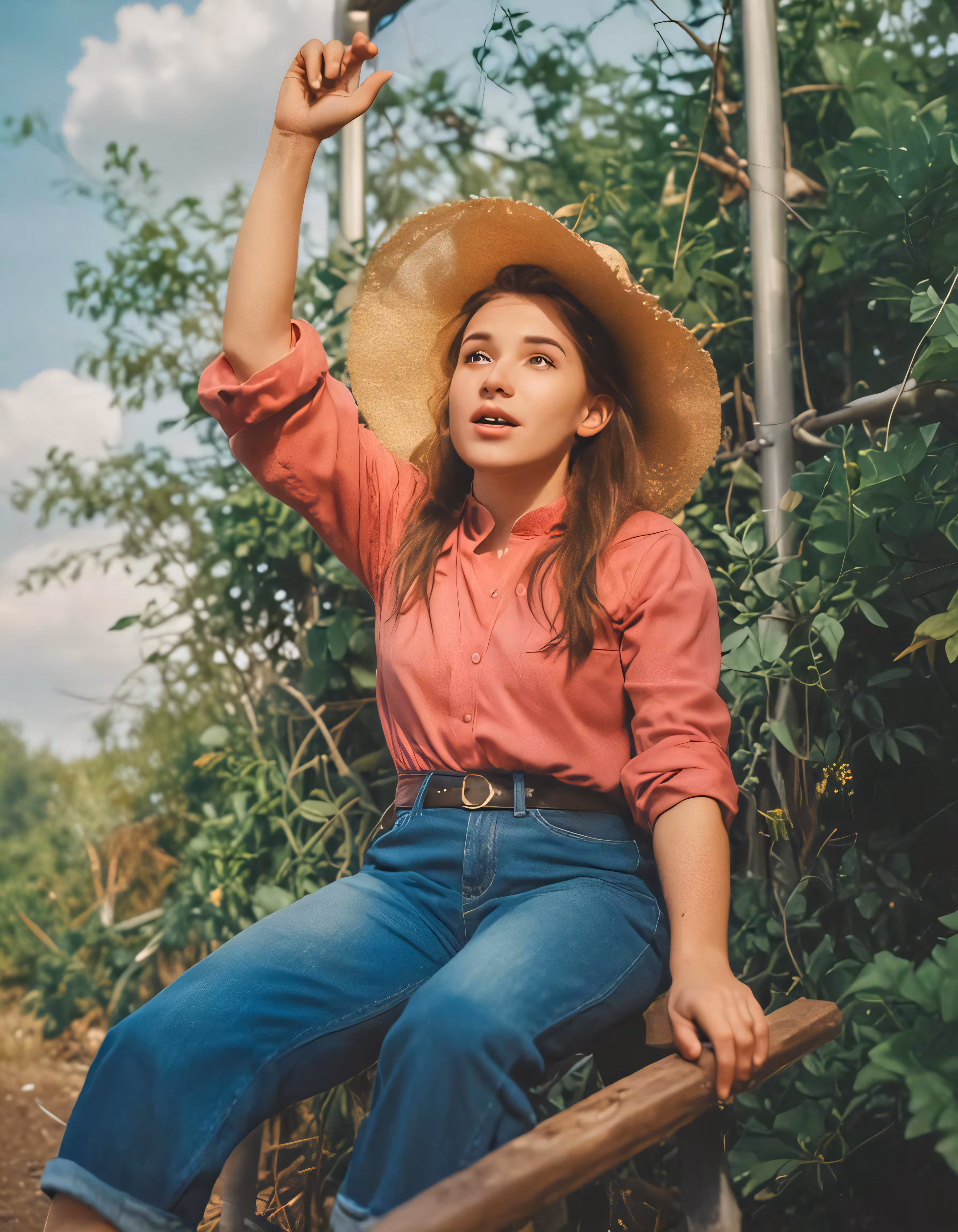 High resolution picture, free to use, a woman wearing a straw hat sits on a rail holding an umbrella