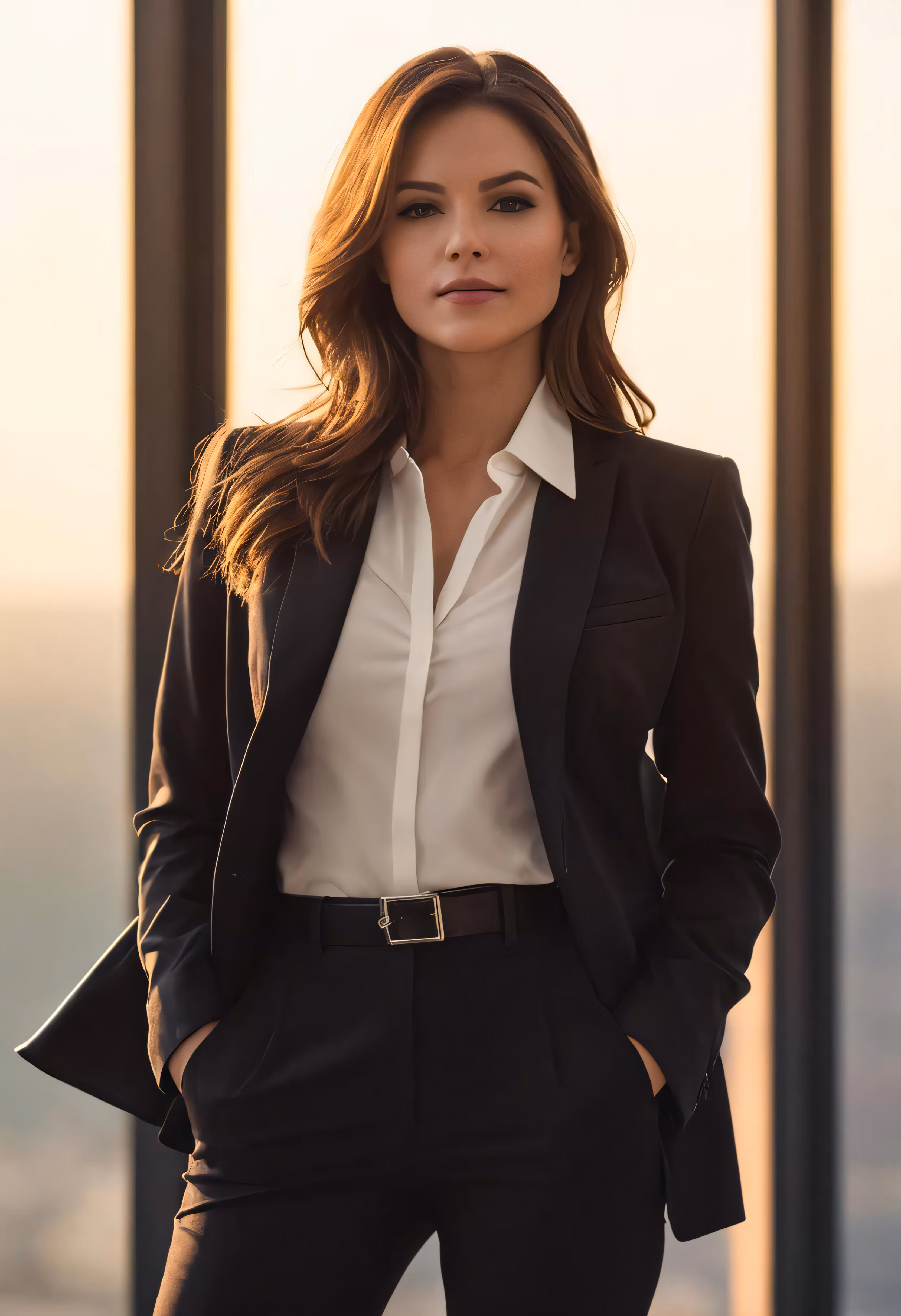 High resolution picture, free to use, a woman wearing a suit standing in front of a tall window