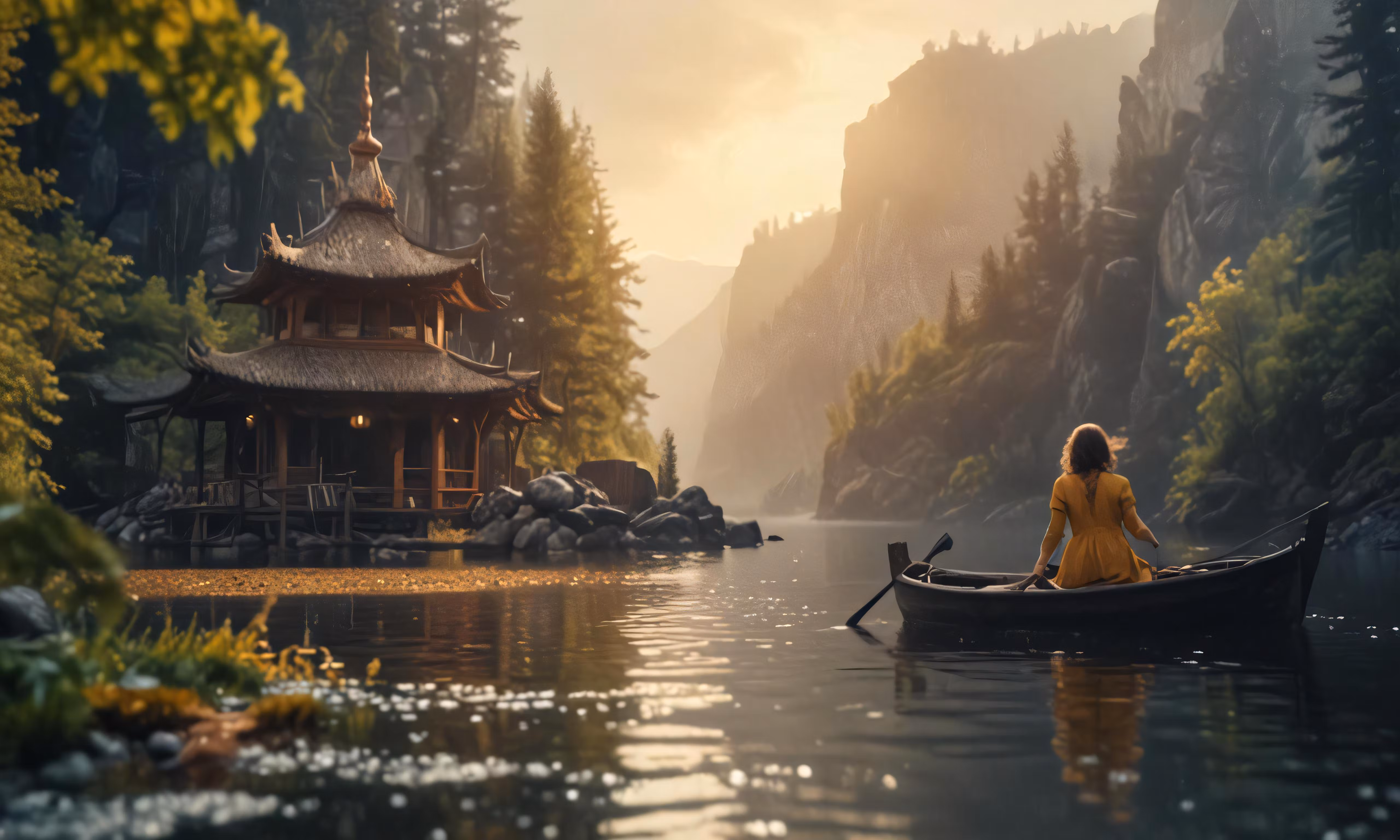 High resolution picture, free to use, a woman wearing a yellow dress is rowing a boat across a body of water
