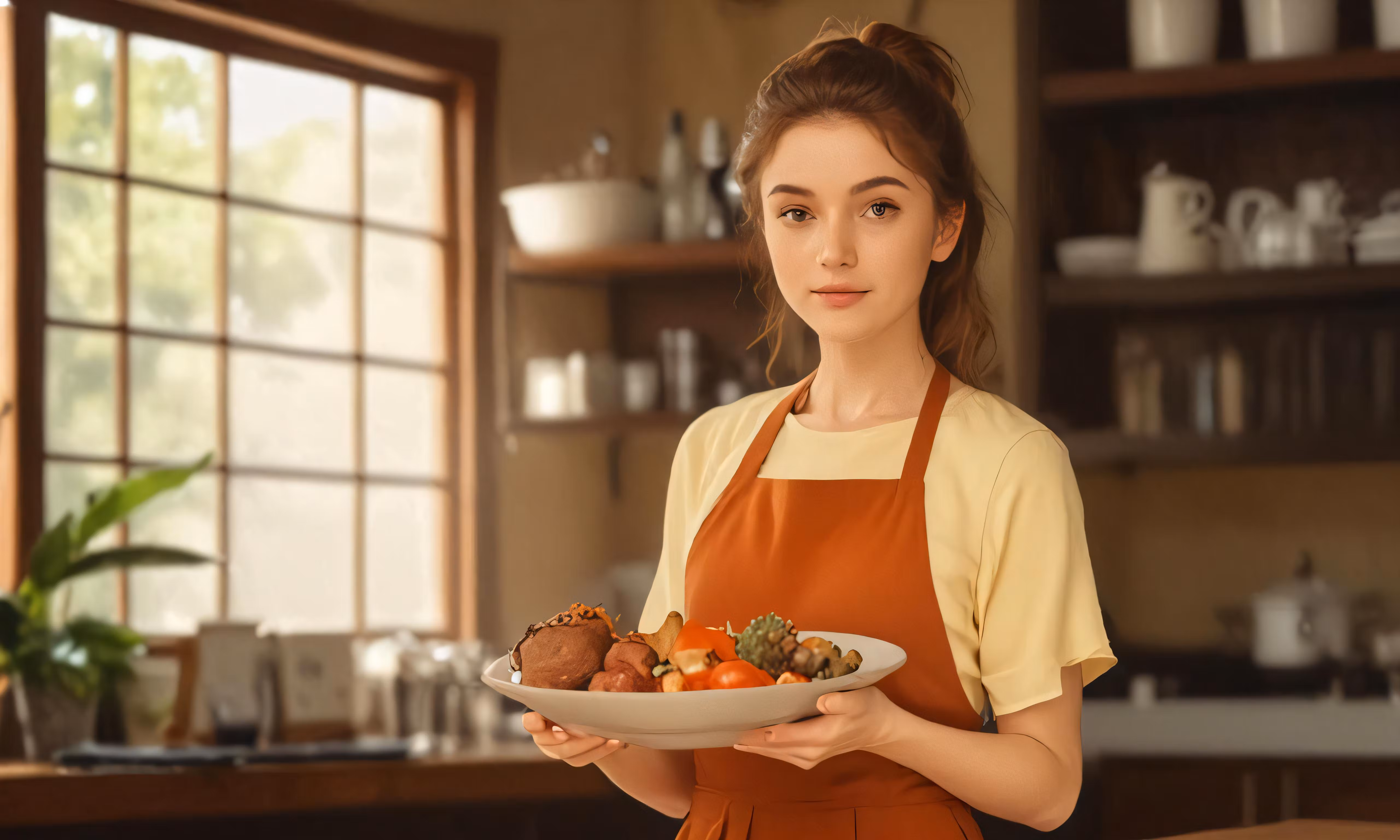 High resolution picture, free to use, a woman wearing an apron is holding a plate with food