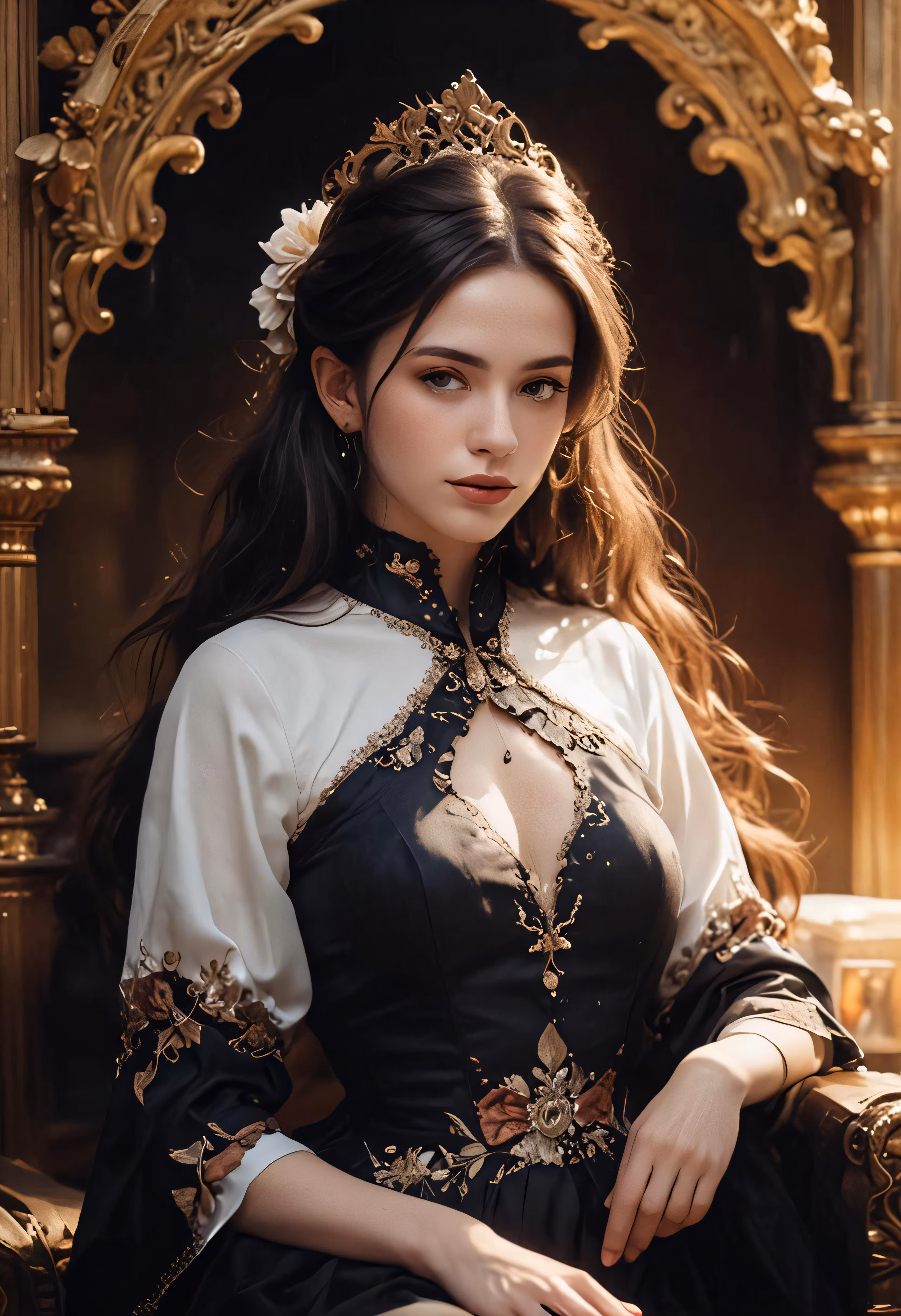 High resolution picture, free to use, a woman wearing an elaborate black and white costume sitting on a chair