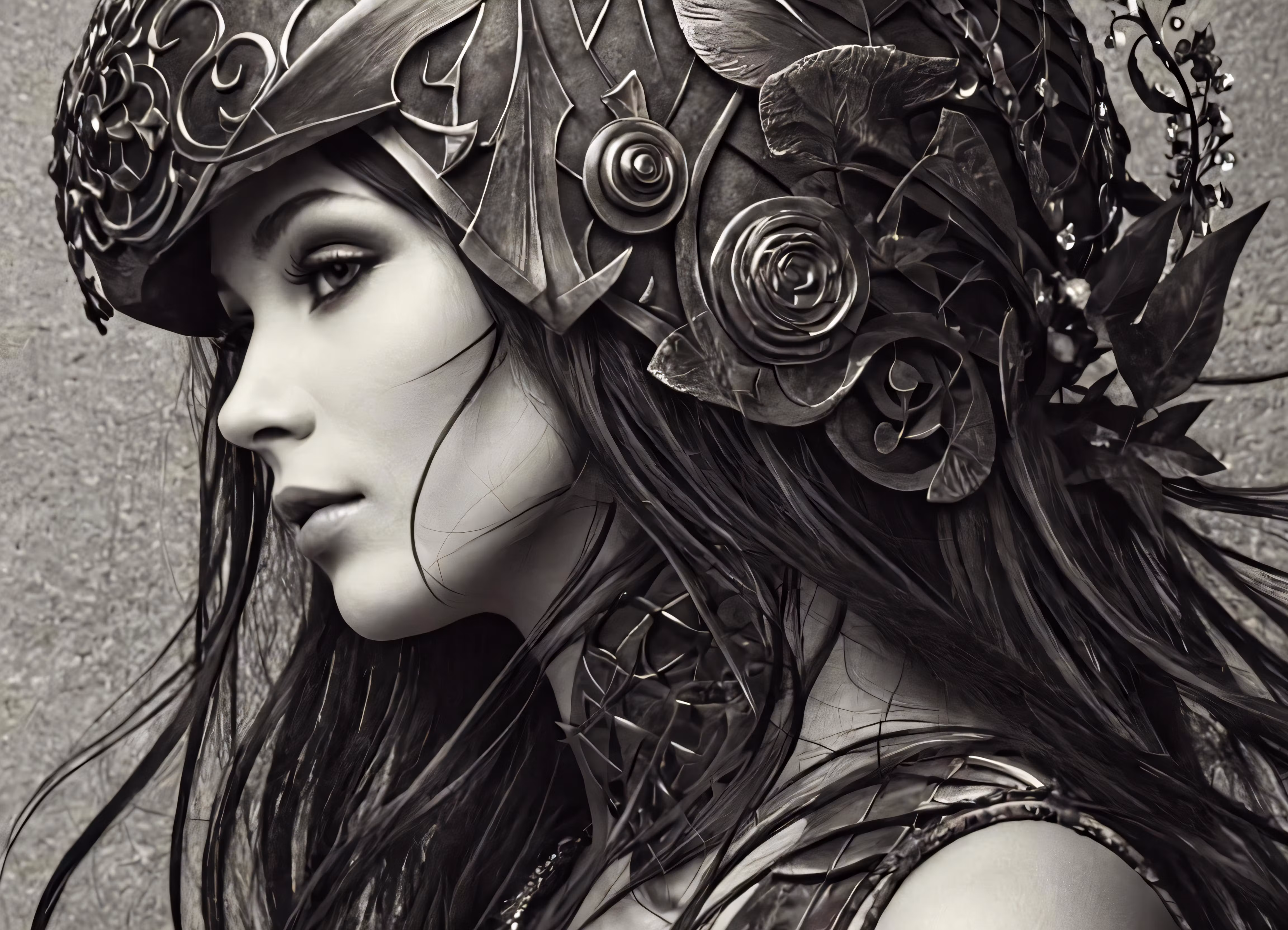 High resolution picture, free to use, a woman wearing an elaborate helmet standing by a wall