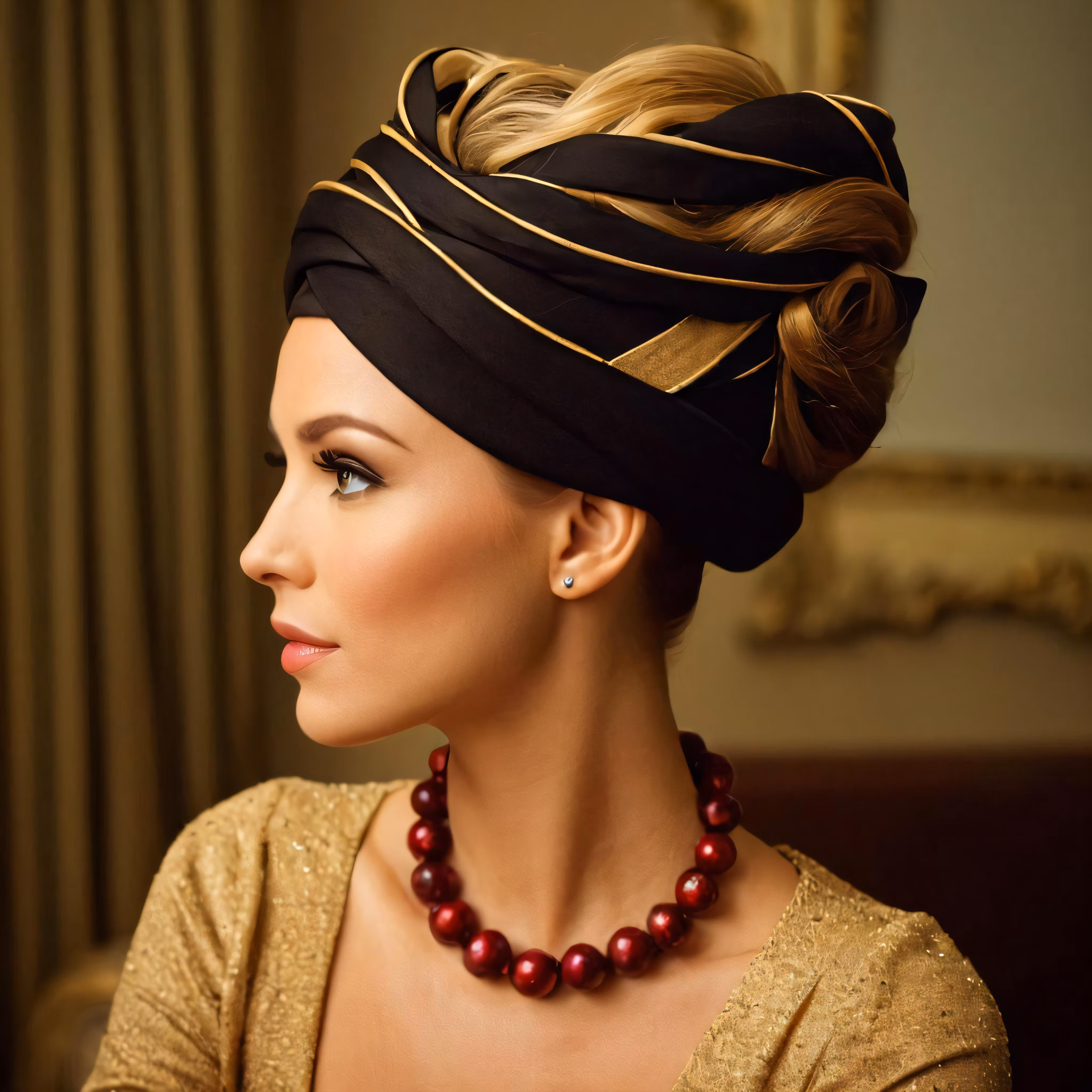 High resolution picture, free to use, a woman wearing an elegant black and gold scarf