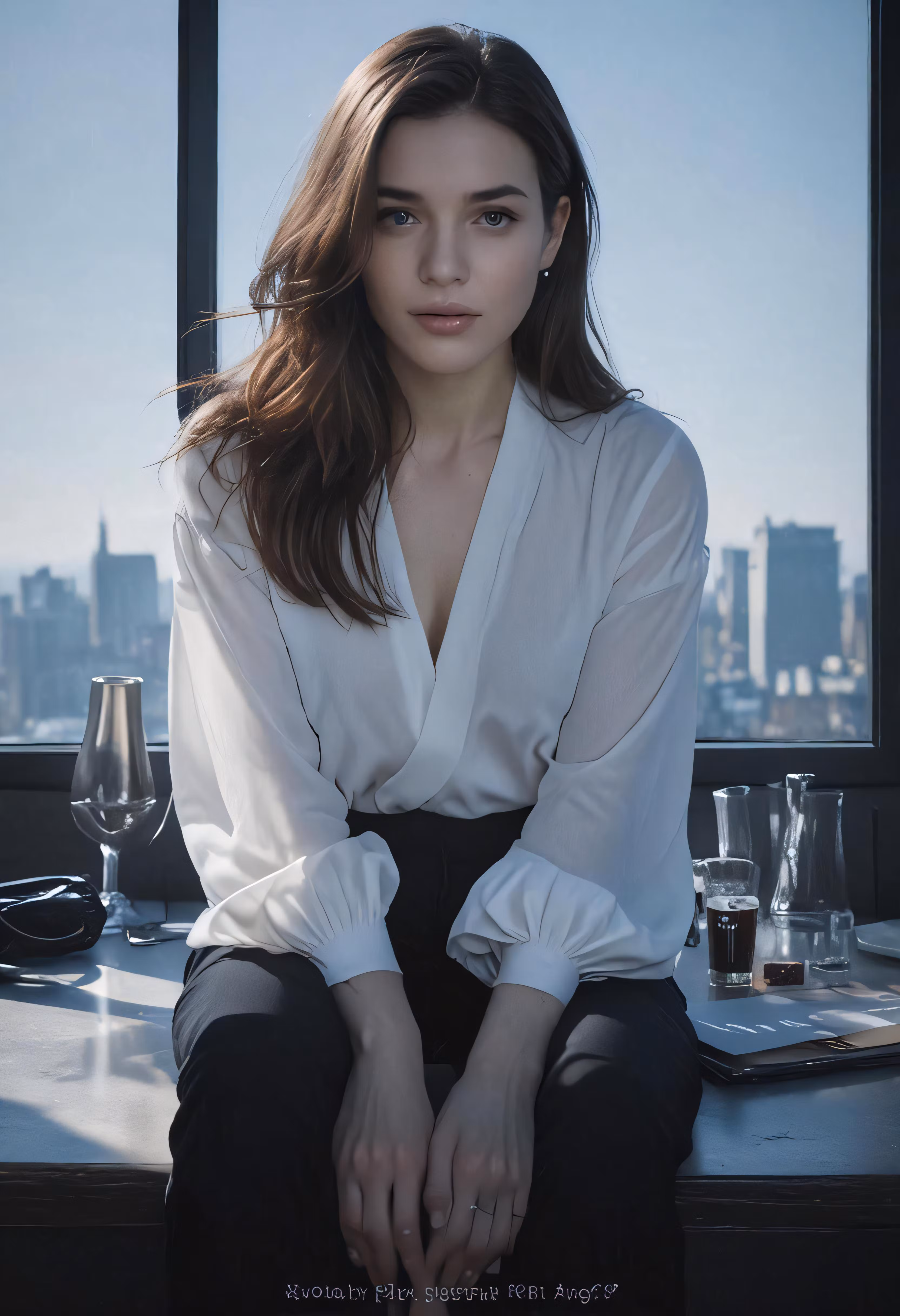 High resolution picture, free to use, a woman wearing black pants sitting next to a window with city view