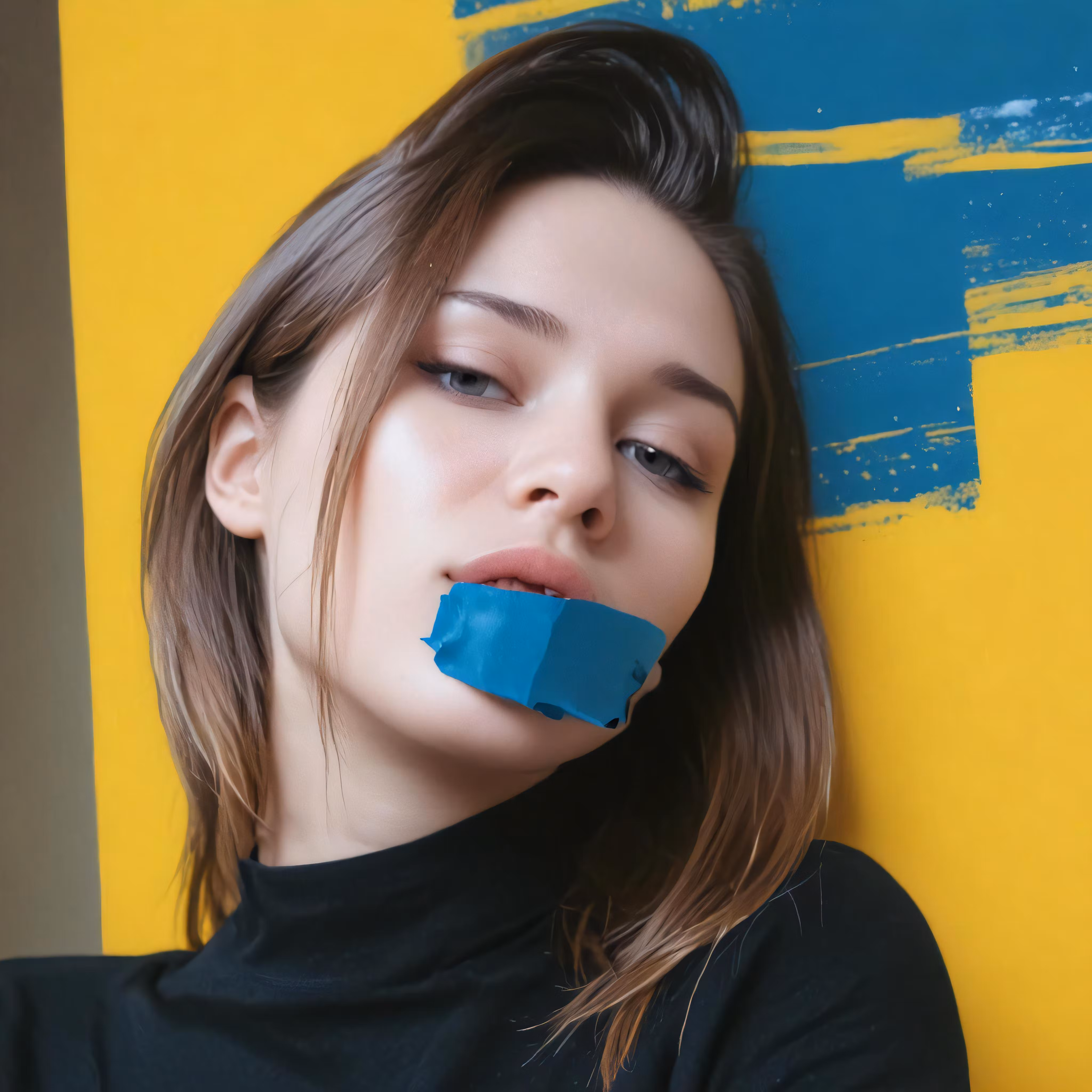High resolution picture, free to use, a woman wearing blue tape to her mouth with a yellow background