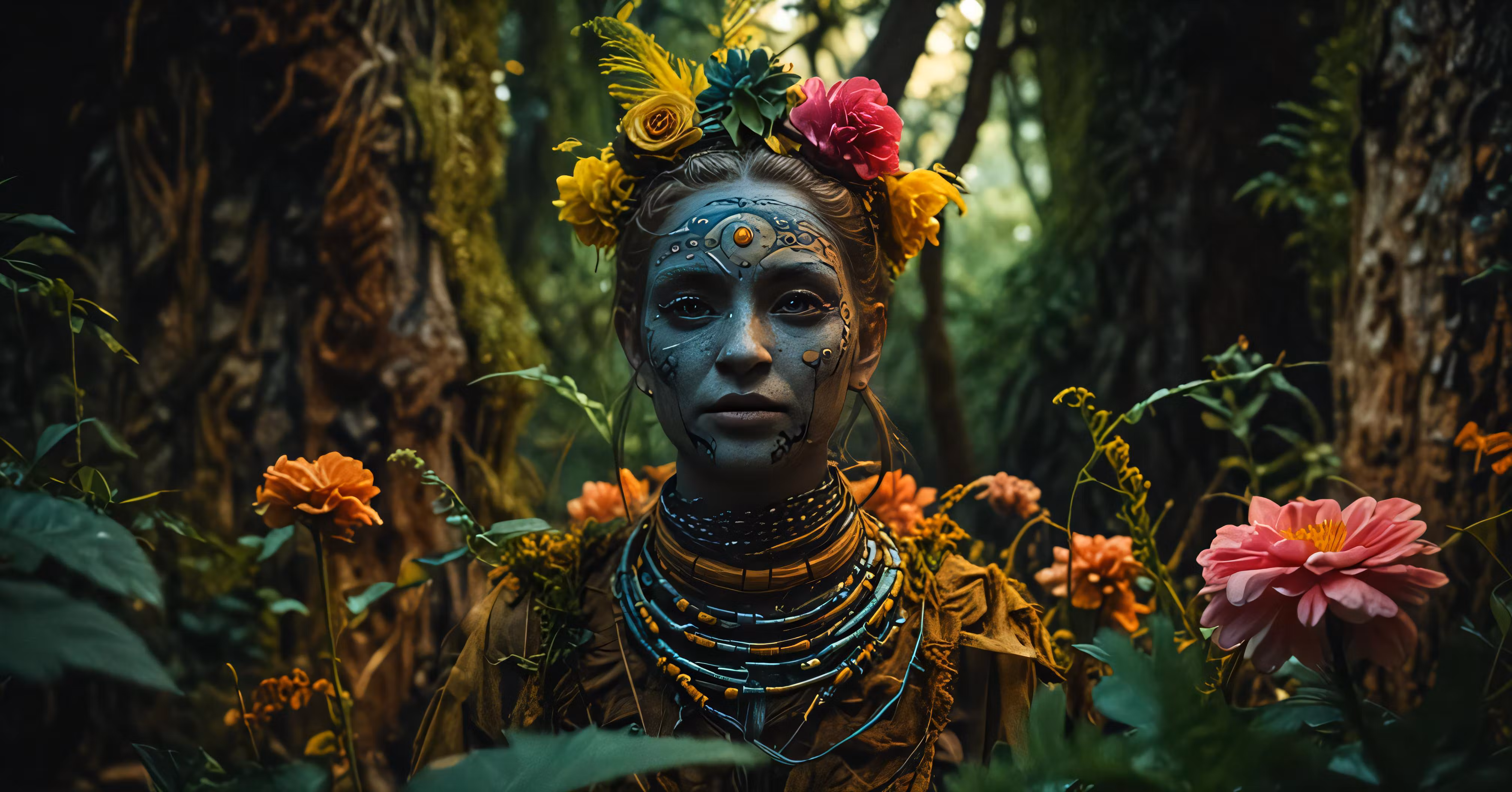 High resolution picture, free to use, a woman wearing elaborate jewelry in the middle of a forest