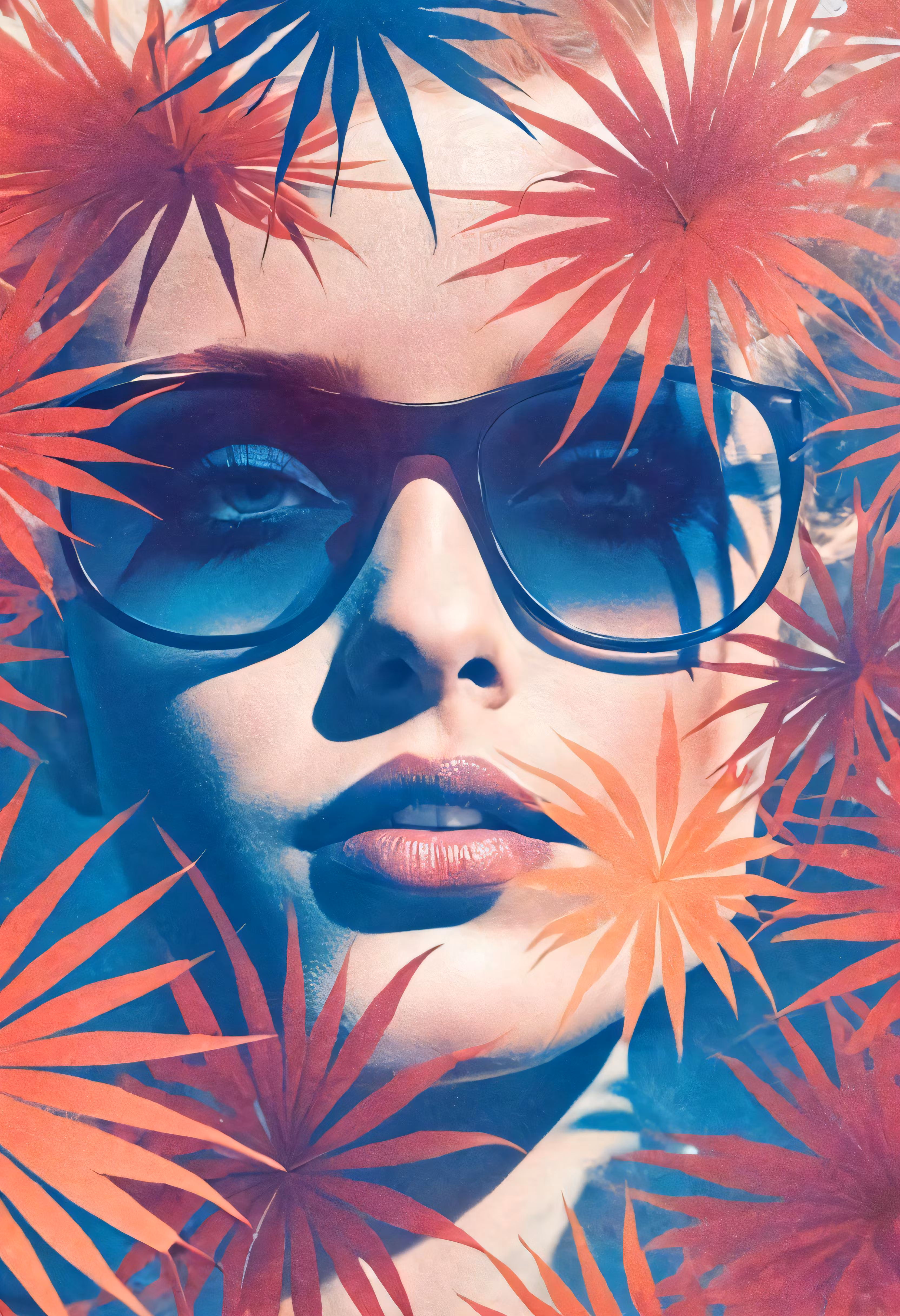 High resolution picture, free to use, a woman wearing glasses is posing in front of some pink flower shapes