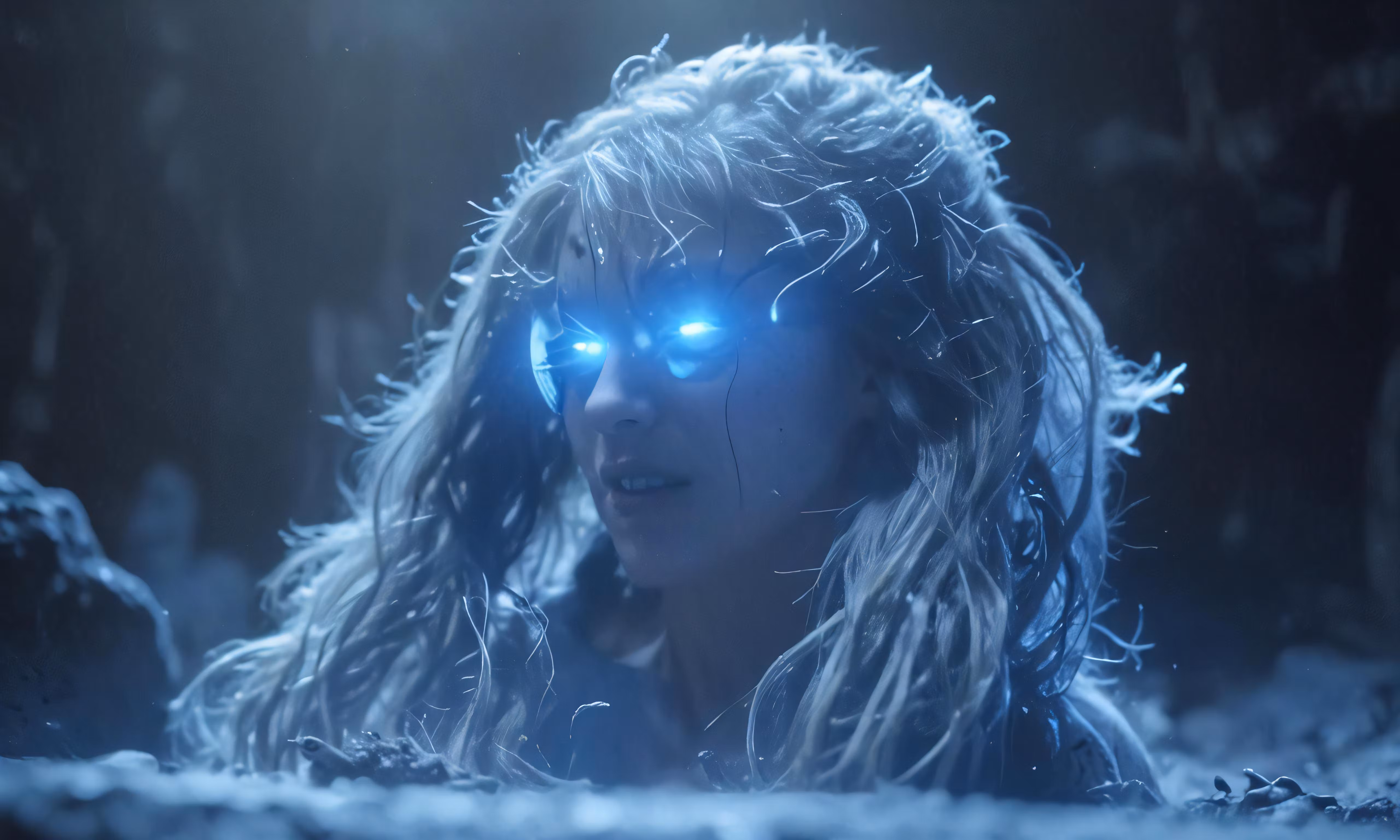 High resolution picture, free to use, a woman wearing glowing glasses walking through snow