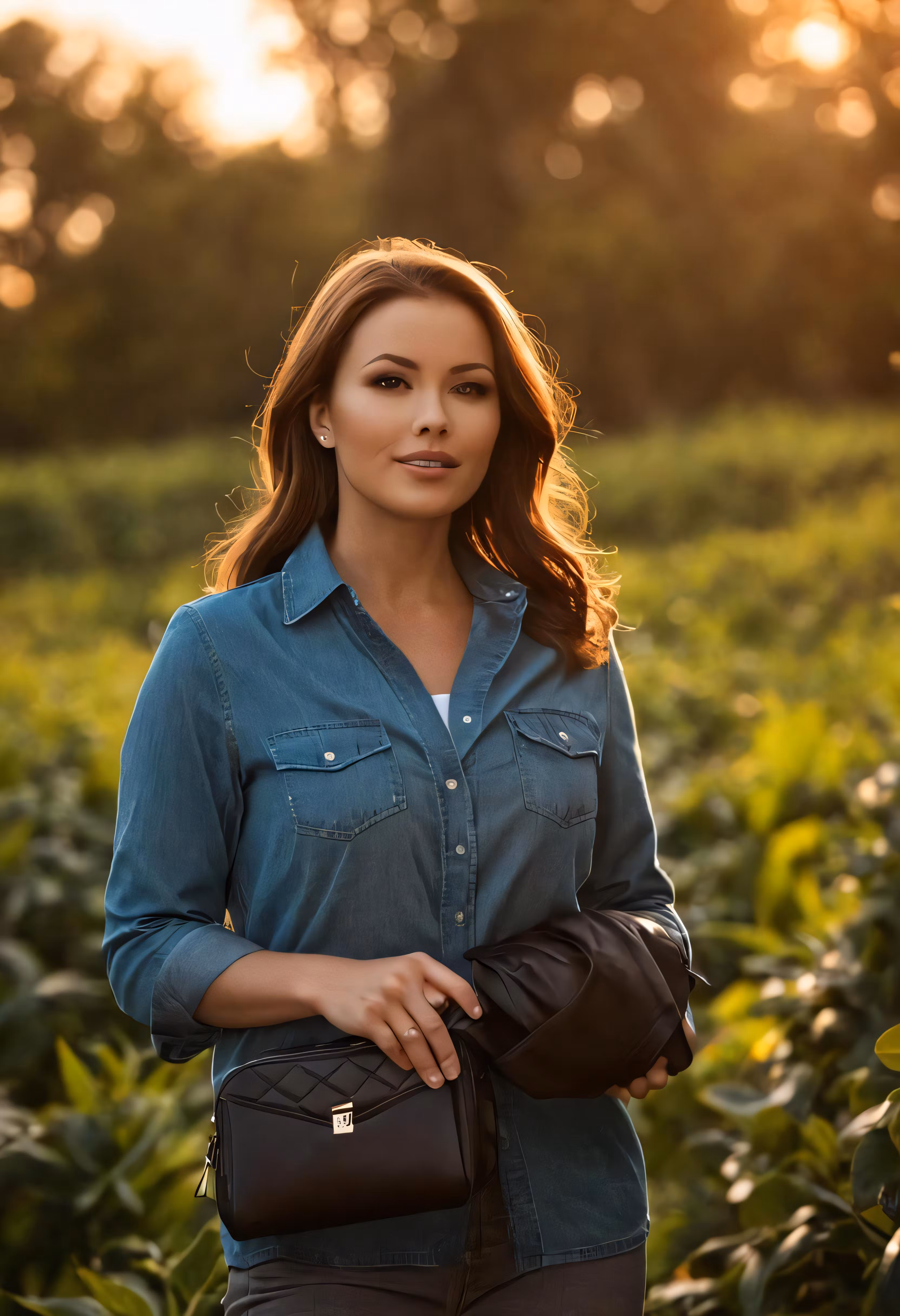 High resolution picture, free to use, a woman wearing jeans holds a purse in front of her