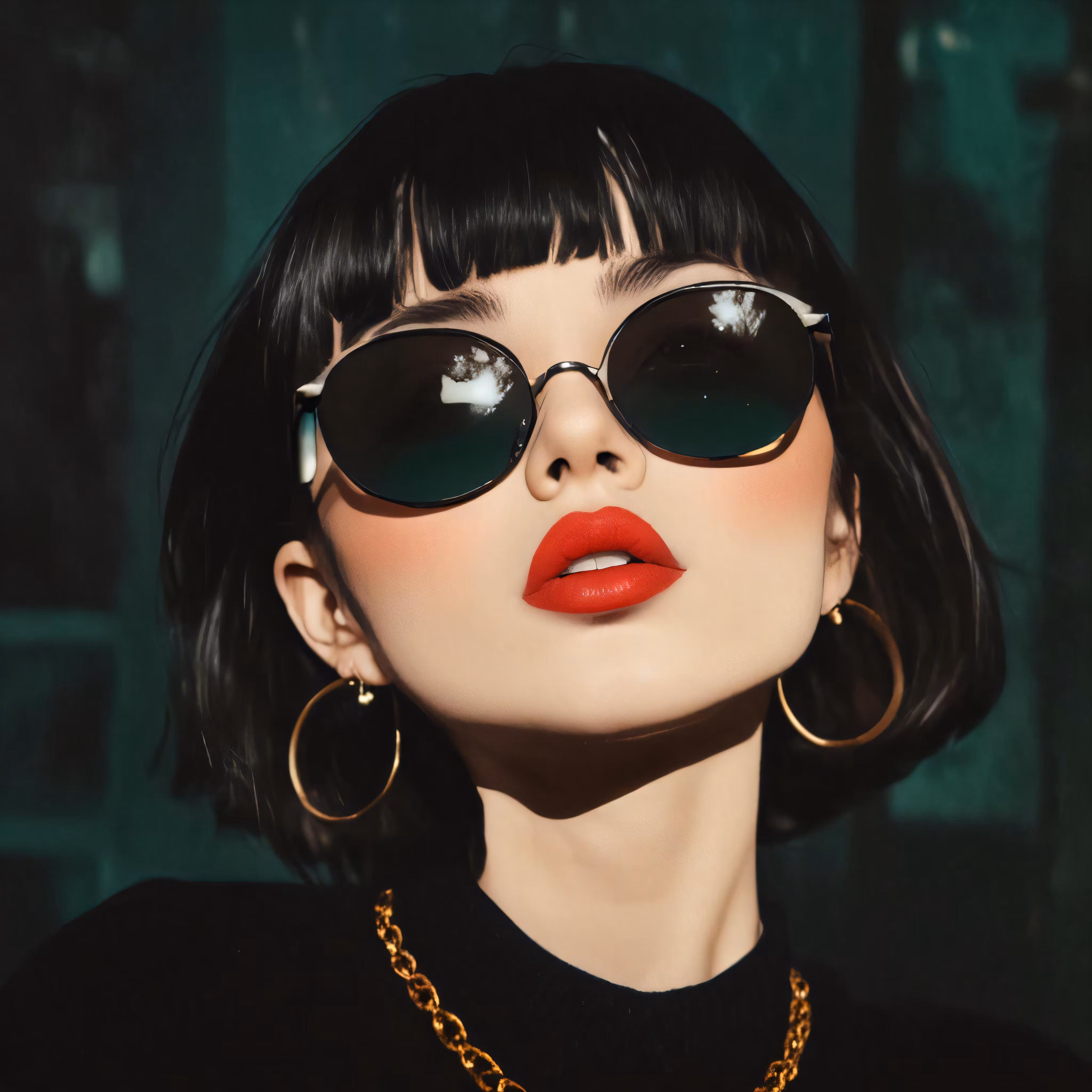 High resolution picture, free to use, a woman wearing round shaped sunglasses and a chain