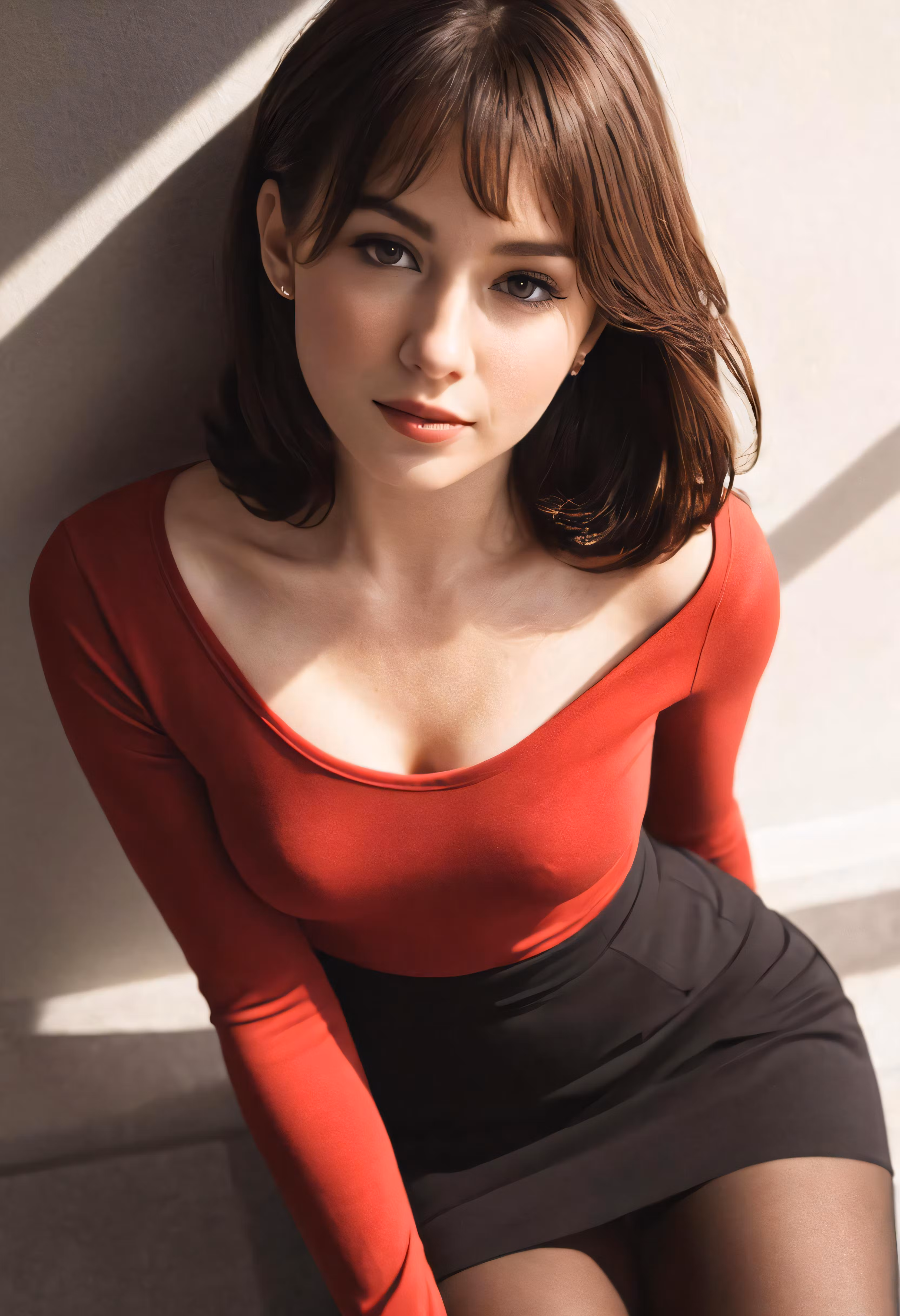 High resolution picture, free to use, a woman wearing tight black stockings and a red top