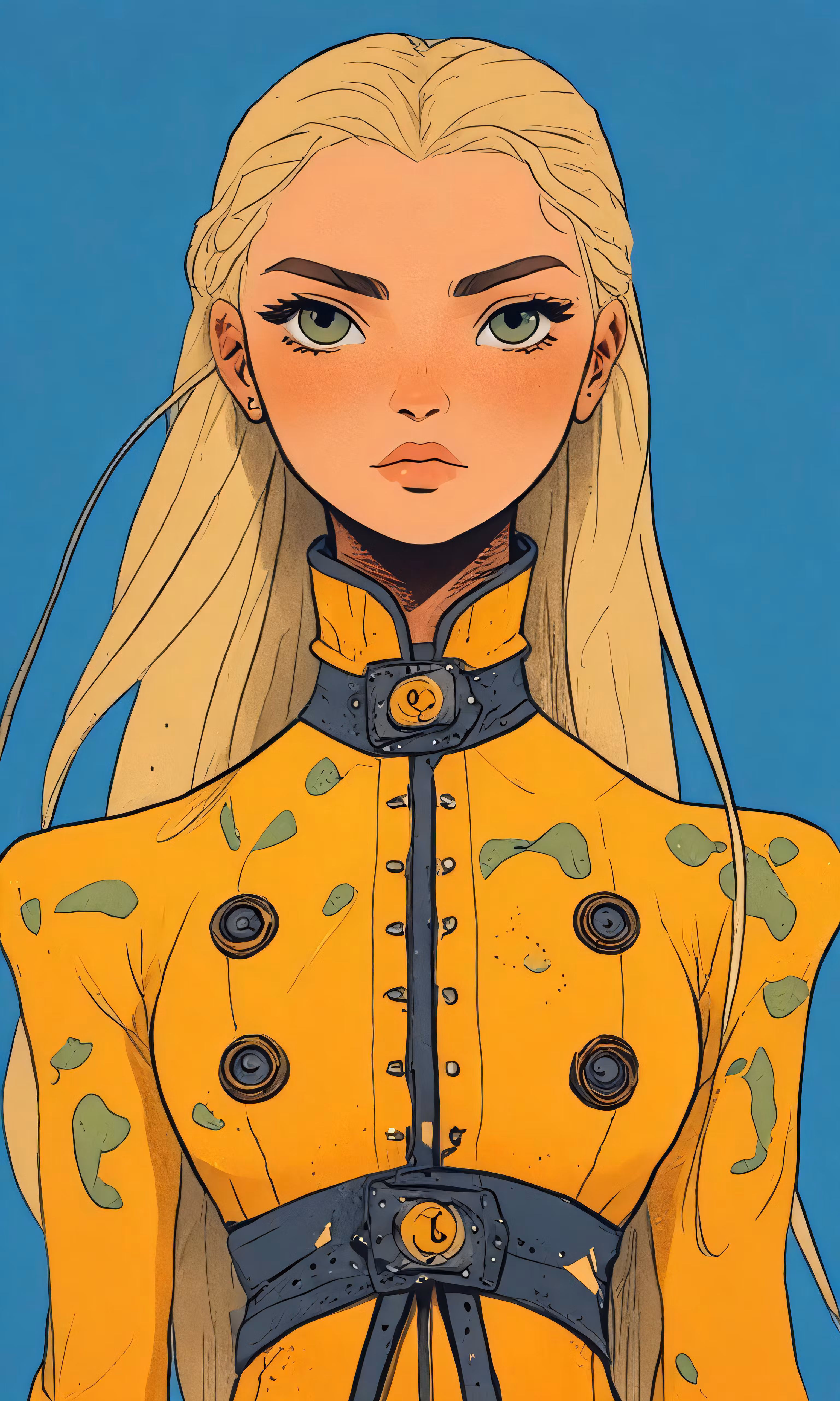 High resolution picture, free to use, a woman wearing yellow and blue is standing in front of a blue sky