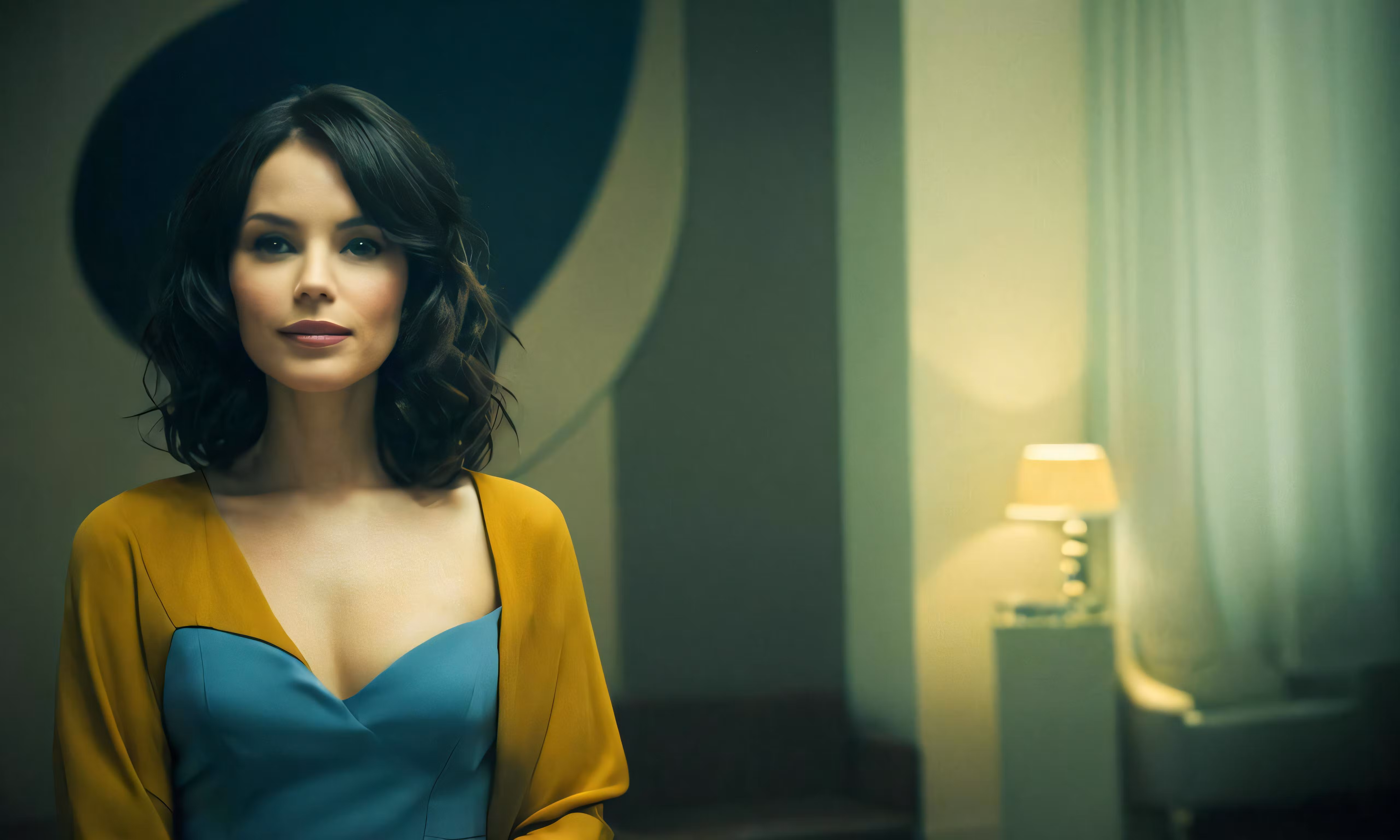High resolution picture, free to use, a woman wearing yellow and blue poses in front of a painting